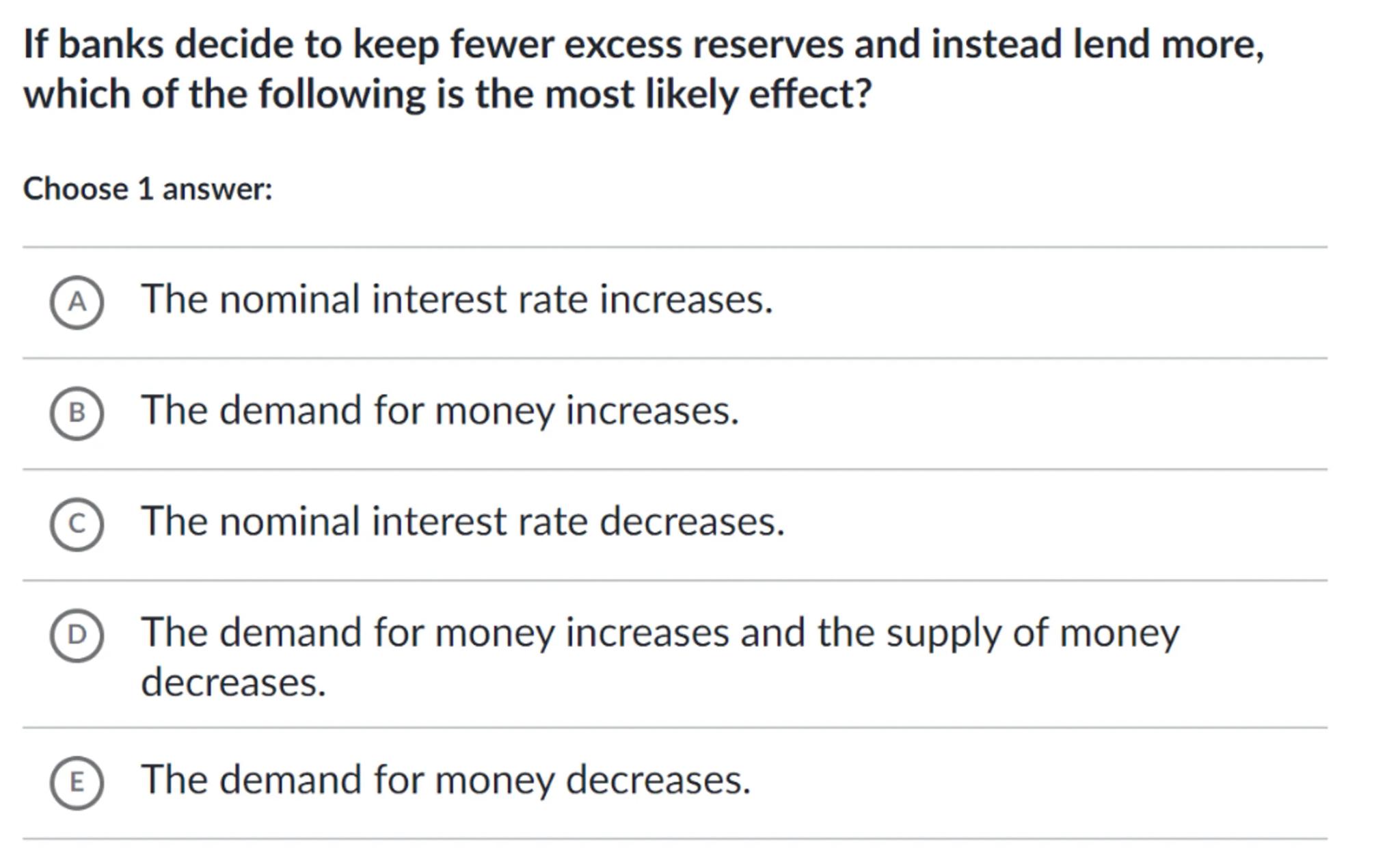 If banks decide to keep fewer excess reserves and instead lend more, which of the following is the most likely effect?
