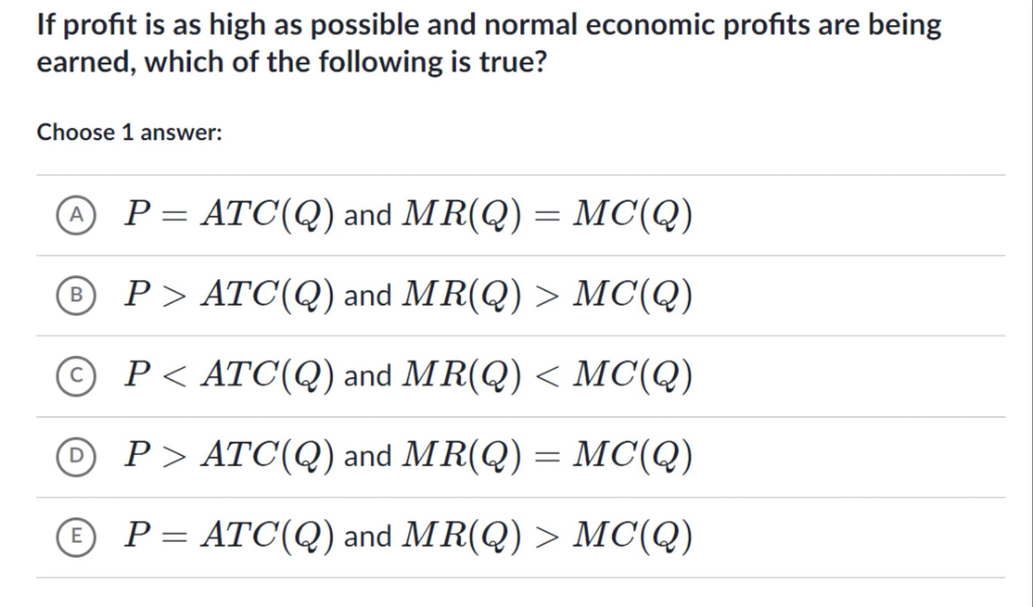 Combining Conditions: Therefore, if a firm is earning normal economic profits and maximizing profit, the conditions P=ATC(Q)P = ATC(Q) and MR(Q)=MC(Q)MR(Q) = MC(Q) must both be true