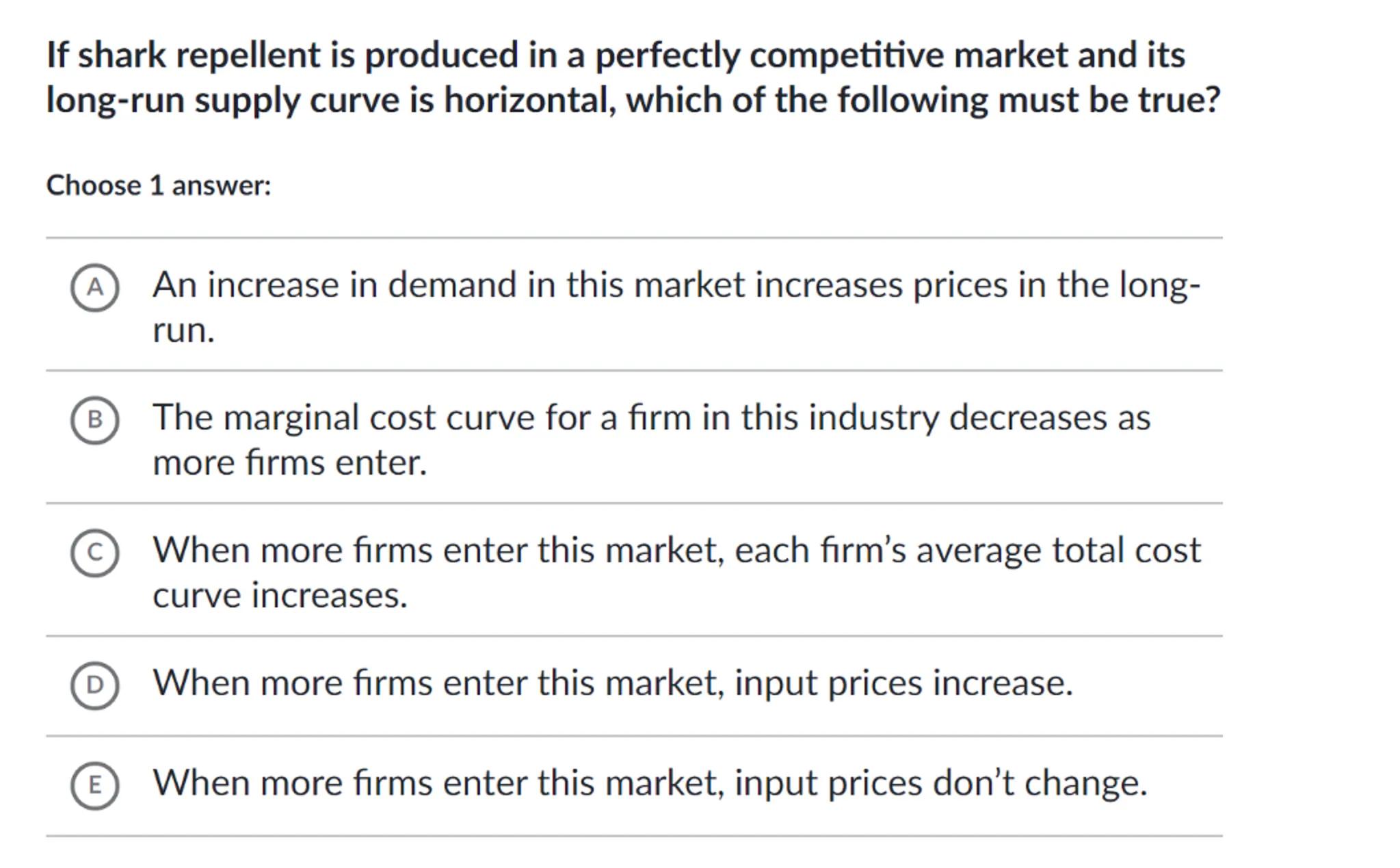 If shark repellent is produced in a perfectly competitive market and its long-run supply curve is horizontal, which of the following must be true?