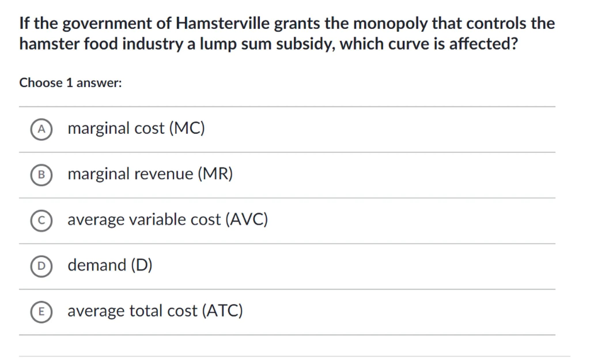 If the government of Hamsterville grants the monopoly that controls the hamster food industry a lump sum subsidy, which curve is affected?