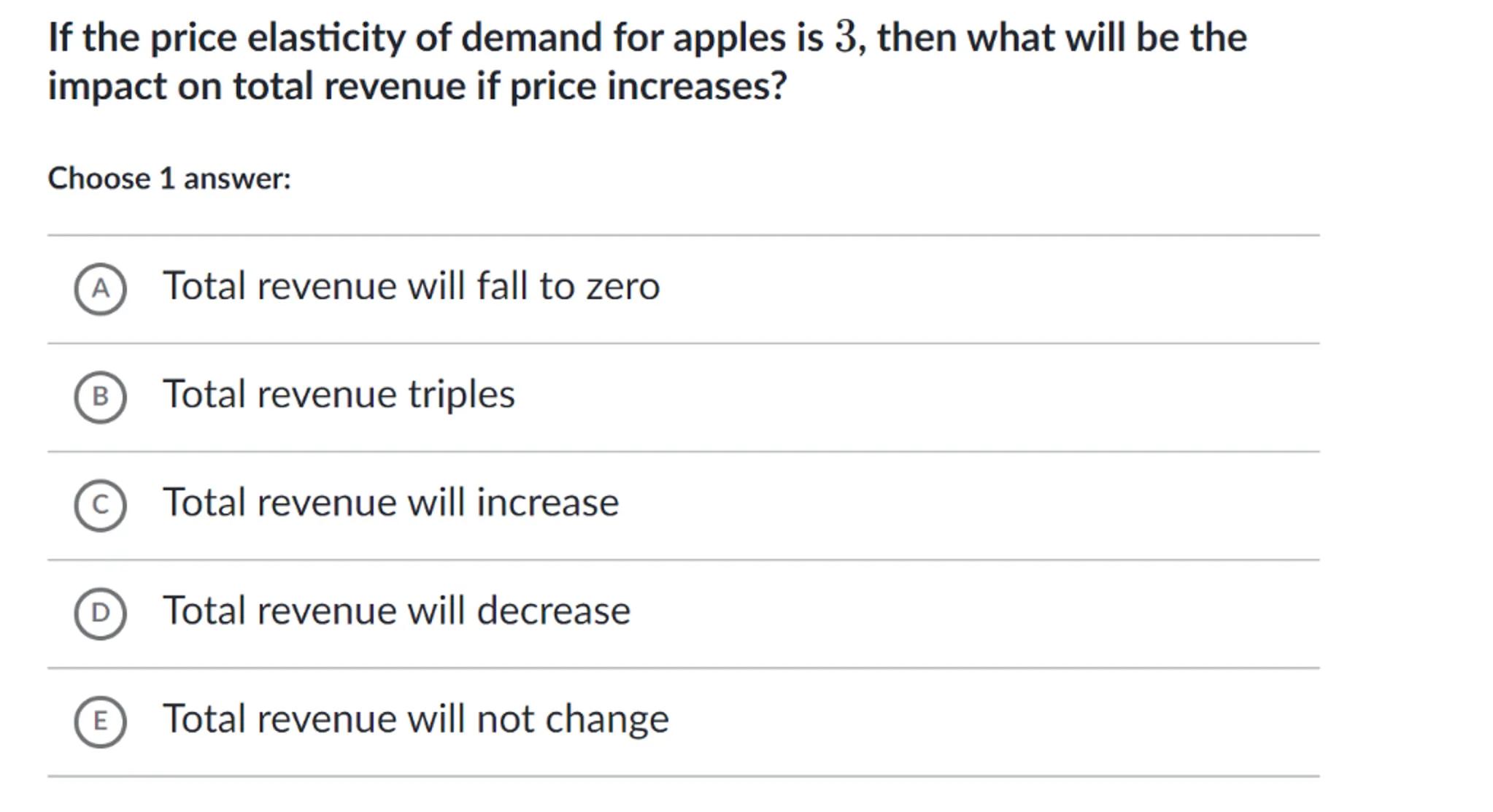 If the price elasticity of demand for apples is 3 , then what will be the impact on total revenue if price increases?