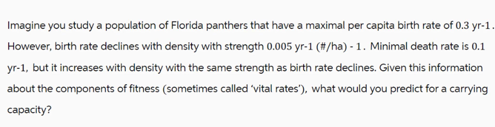 Imagine you study a population of Florida panthers that have a maximal per capita birth rate of . However, birth rate declines with density with strength (\#/ha) - 1 . Minimal death rate is 0.1 , but it increases with density with the same strength as birth rate declines. Given this information about the components of fitness (sometimes called 'vital rates'), what would you predict for a carrying capacity?