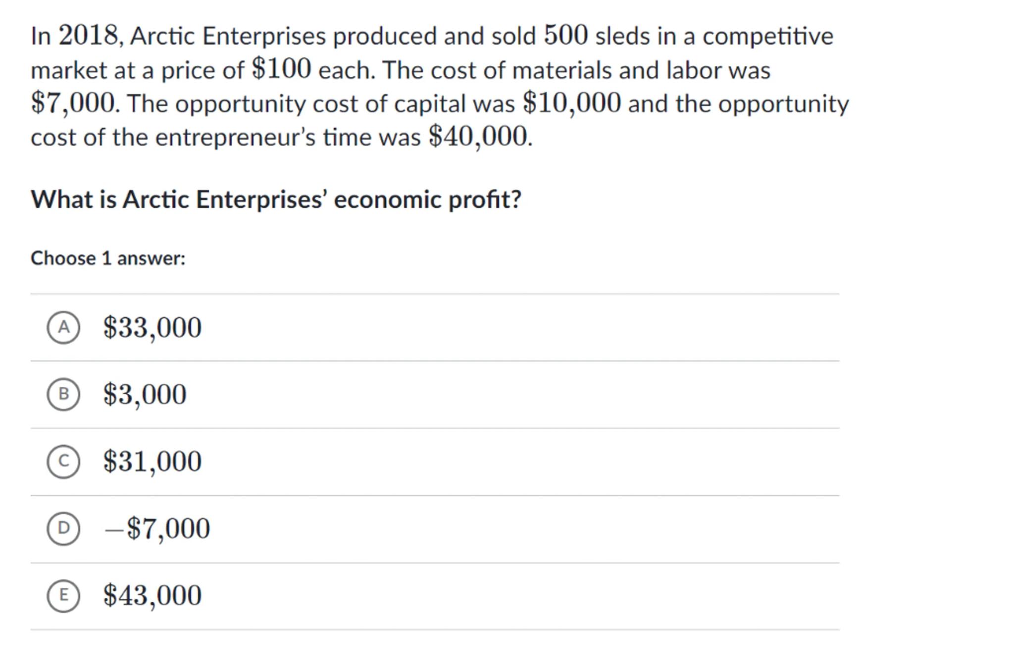 In 2018, Arctic Enterprises produced and sold 500 sleds in a competitive market at a price of each. The cost of materials and labor was . The opportunity cost of capital was and the opportunity cost of the entrepreneur's time was .