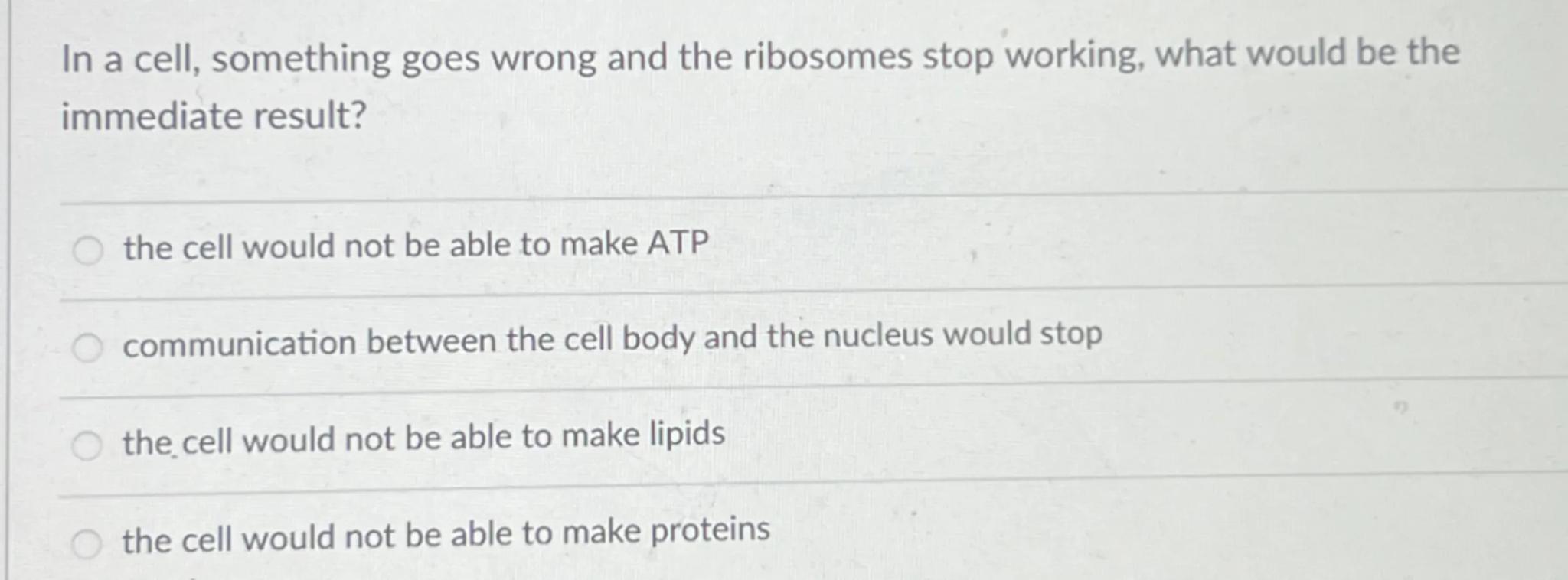In a cell, something goes wrong and the ribosomes stop working, what would be the immediate result?