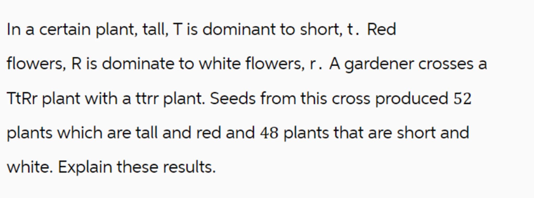 In a certain plant, tall, is dominant to short, . Red flowers, is dominate to white flowers, . A gardener crosses a TtRr plant with a ttrr plant. Seeds from this cross produced 52 plants which are tall and red and 48 plants that are short and white. Explain these results.