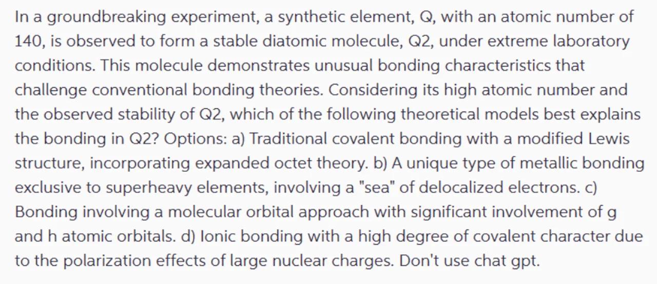 In a groundbreaking experiment, a synthetic element, , with an atomic number of 140 , is observed to form a stable diatomic molecule, , under extreme laboratory conditions. This molecule demonstrates unusual bonding characteristics that challenge conventional bonding theories. Considering its high atomic number and the observed stability of Q2, which of the following theoretical models best explains the bonding in Q2? Options: a) Traditional covalent bonding with a modified Lewis structure, incorporating expanded octet theory. b) A unique type of metallic bonding exclusive to superheavy elements, involving a "sea" of delocalized electrons. c) Bonding involving a molecular orbital approach with significant involvement of  and  atomic orbitals. d) lonic bonding with a high degree of covalent character due to the polarization effects of large nuclear charges. Don't use chat gpt.