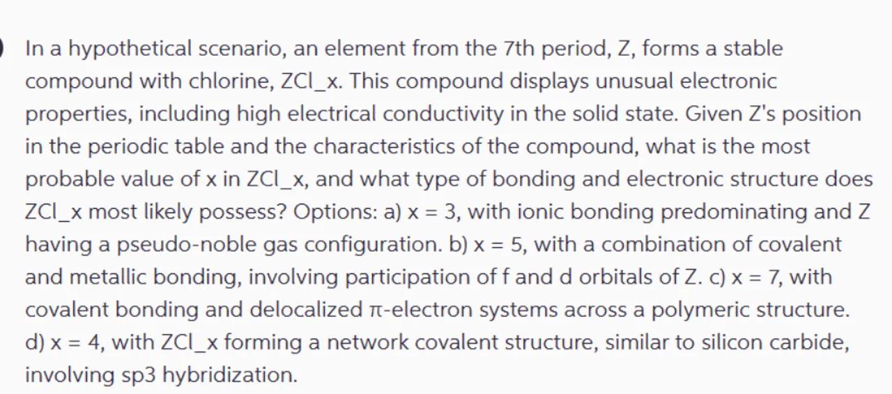In a hypothetical scenario, an element from the 7th period, Z, forms a stable compound with chlorine, ZCl_x. This compound displays unusual electronic properties, including high electrical conductivity in the solid state. Given Z's position in the periodic table and the characteristics of the compound, what is the most probable value of in , and what type of bonding and electronic structure does ZCl_x most likely possess? Options: a) , with ionic bonding predominating and Z having a pseudo-noble gas configuration. b) , with a combination of covalent and metallic bonding, involving participation of and orbitals of Z. c) , with covalent bonding and delocalized -electron systems across a polymeric structure. d) , with ZCl_ forming a network covalent structure, similar to silicon carbide, involving sp3 hybridization.