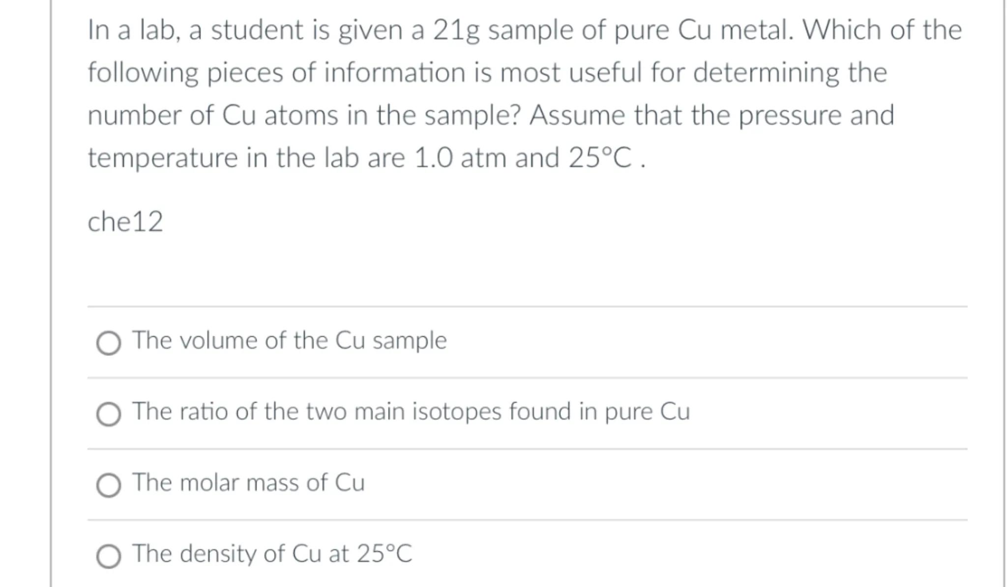 In a lab, a student is given a sample of pure Cu metal. Which of the following pieces of information is most useful for determining the number of atoms in the sample? Assume that the pressure and temperature in the lab are and .