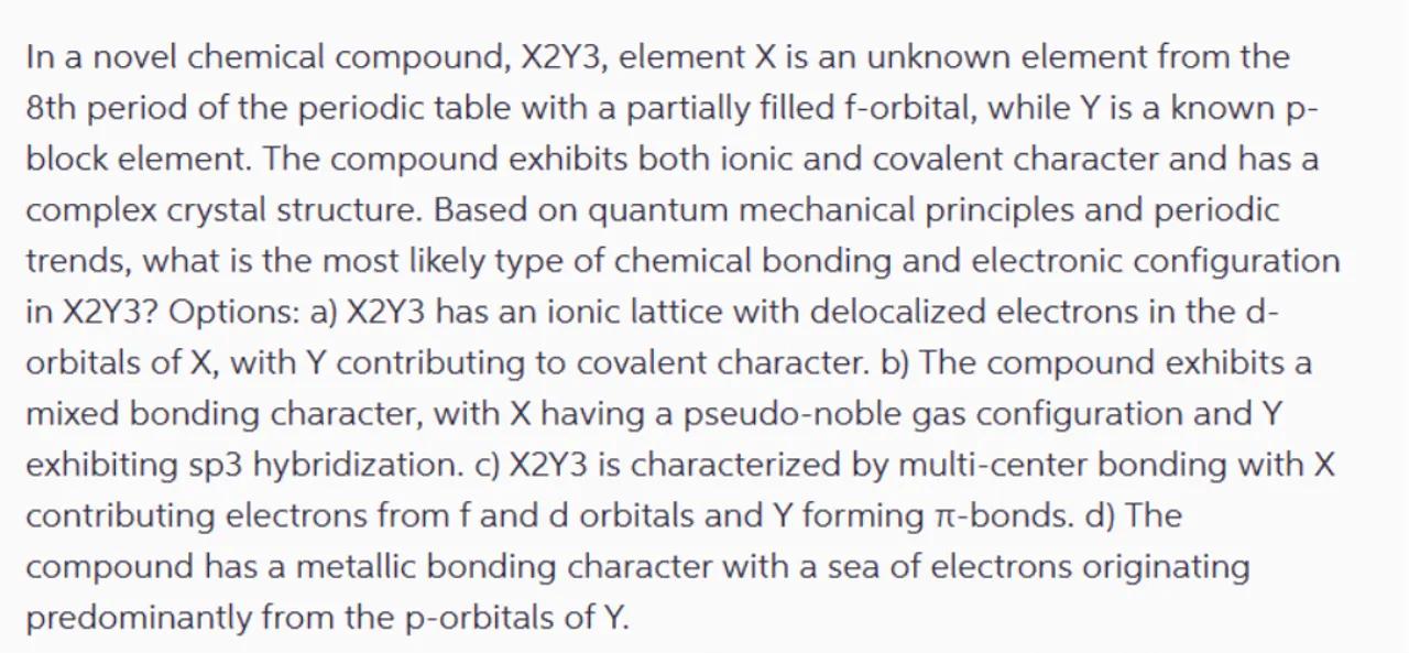 In a novel chemical compound, , element is an unknown element from the 8th period of the periodic table with a partially filled f-orbital, while is a known pblock element. The compound exhibits both ionic and covalent character and has a complex crystal structure. Based on quantum mechanical principles and periodic trends, what is the most likely type of chemical bonding and electronic configuration in X2Y3? Options: a) X2Y3 has an ionic lattice with delocalized electrons in the dorbitals of , with contributing to covalent character. b) The compound exhibits a mixed bonding character, with having a pseudo-noble gas configuration and exhibiting sp3 hybridization. c) is characterized by multi-center bonding with contributing electrons from and orbitals and forming -bonds. d) The compound has a metallic bonding character with a sea of electrons originating predominantly from the -orbitals of .