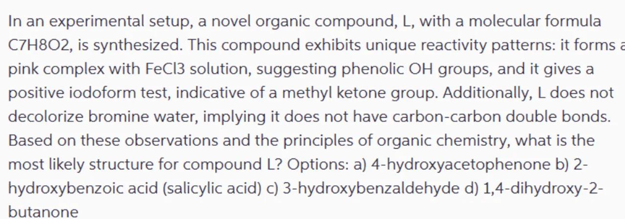 In an experimental setup, a novel organic compound, L, with a molecular formula , is synthesized. This compound exhibits unique reactivity patterns: it forms pink complex with solution, suggesting phenolic groups, and it gives a positive iodoform test, indicative of a methyl ketone group. Additionally, L does not decolorize bromine water, implying it does not have carbon-carbon double bonds. Based on these observations and the principles of organic chemistry, what is the most likely structure for compound L? Options: a) 4-hydroxyacetophenone b) 2 hydroxybenzoic acid (salicylic acid) c) 3-hydroxybenzaldehyde d) 1,4-dihydroxy-2butanone