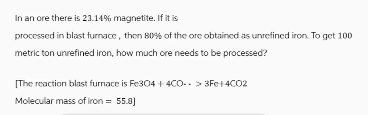 In an ore there is magnetite. If it is processed in blast furnace, then of the ore obtained as unrefined iron. To get 100 metric ton unrefined iron, how much ore needs to be processed?