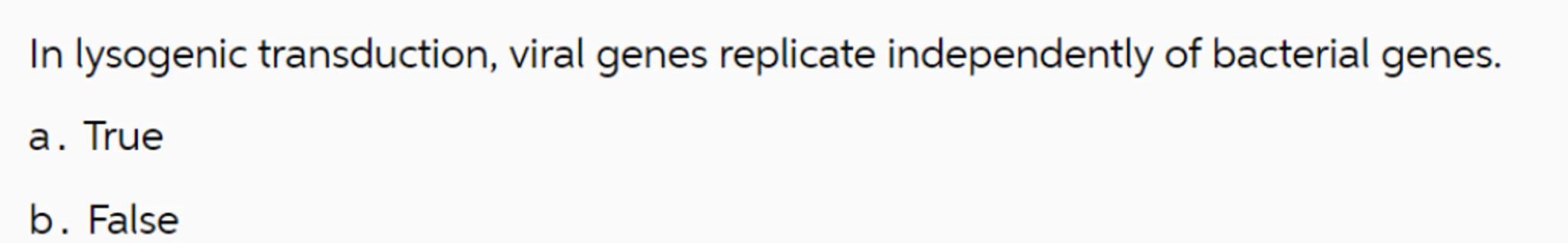 In lysogenic transduction, viral genes replicate independently of bacterial genes.