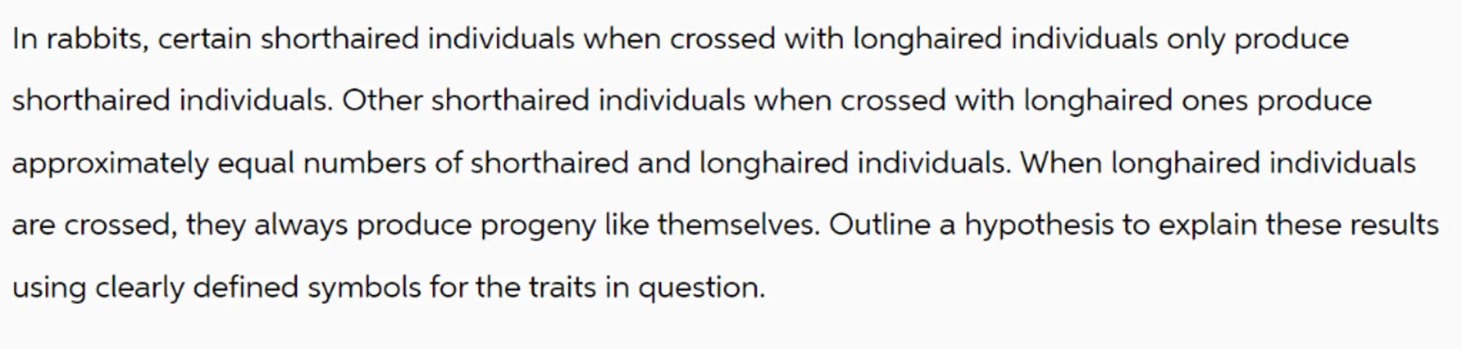 In rabbits, certain shorthaired individuals when crossed with longhaired individuals only produce shorthaired individuals. Other shorthaired individuals when crossed with longhaired ones produce approximately equal numbers of shorthaired and longhaired individuals. When longhaired individuals are crossed, they always produce progeny like themselves. Outline a hypothesis to explain these results using clearly defined symbols for the traits in question.