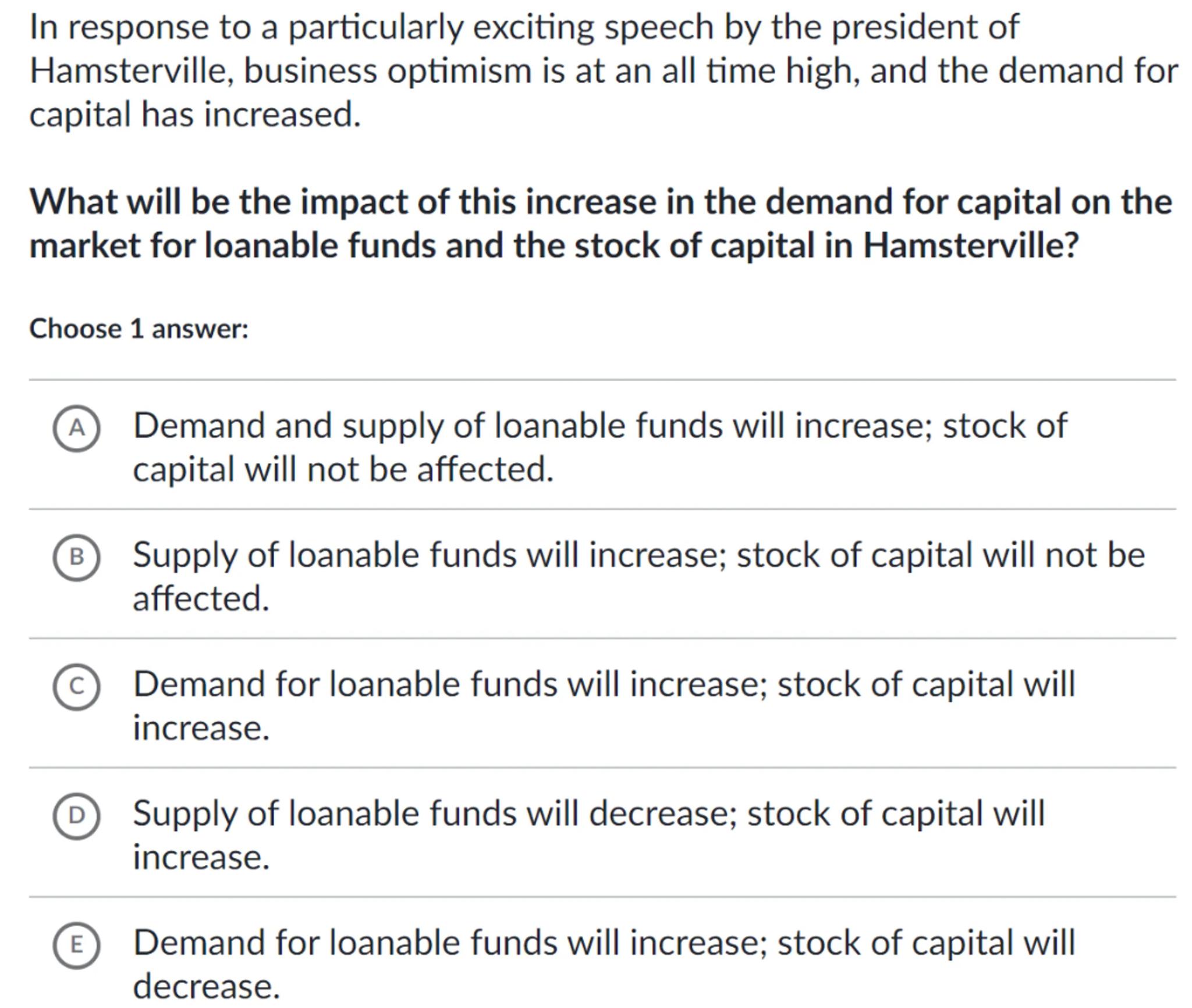 (E) Demand for loanable funds will increase; stock of capital will decrease.