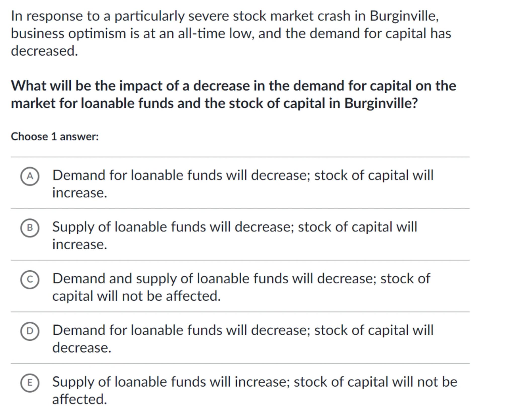 In response to a particularly severe stock market crash in Burginville, business optimism is at an all-time low, and the demand for capital has decreased.