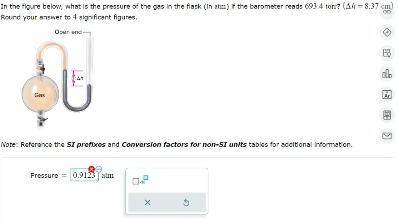 In the figure below, what is the pressure of the gas in the flask (in atm) if the barometer reads 693.4 torr? Round your answer to 4 significant figures.