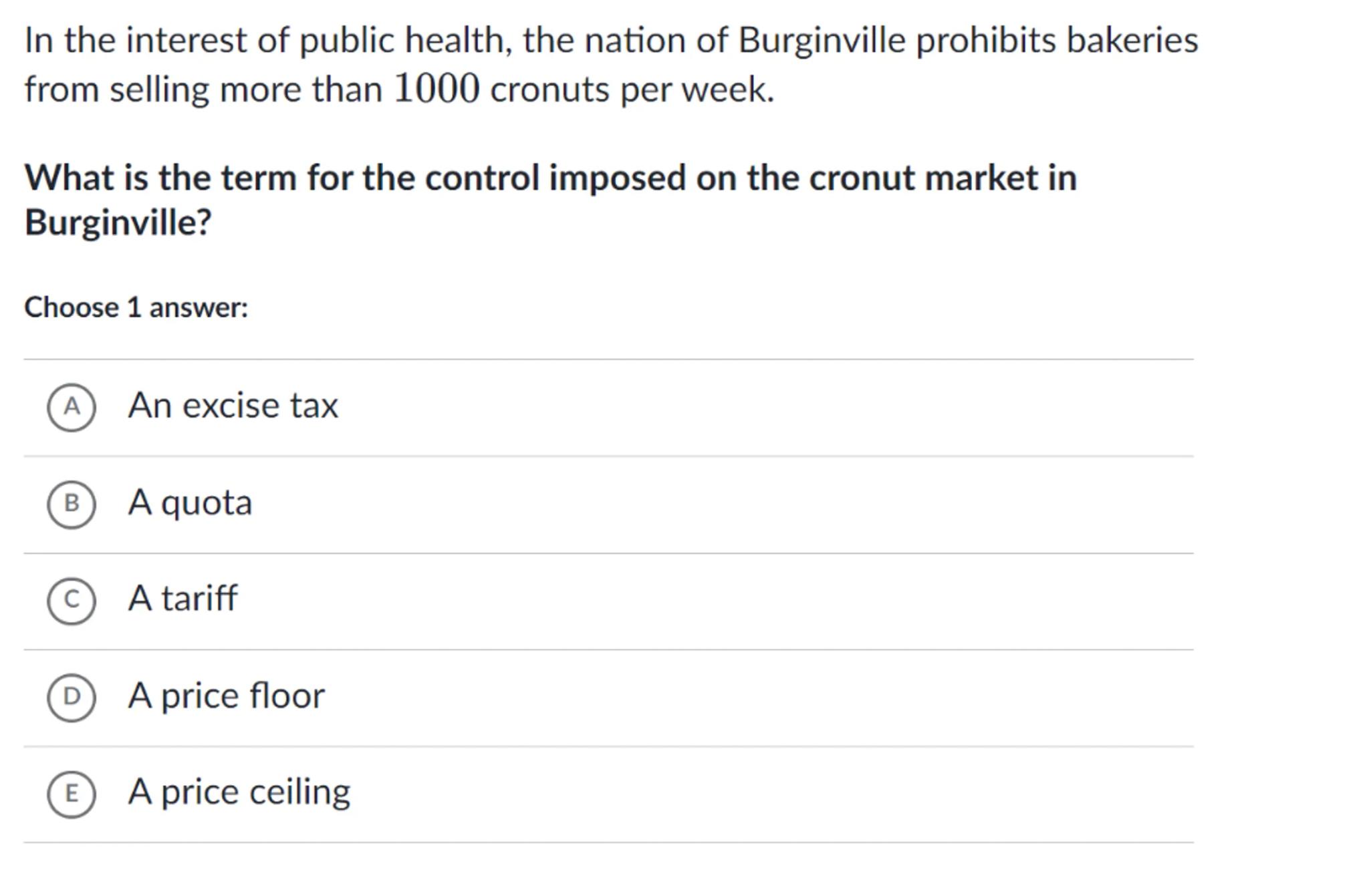In the interest of public health, the nation of Burginville prohibits bakeries from selling more than 1000 cronuts per week.