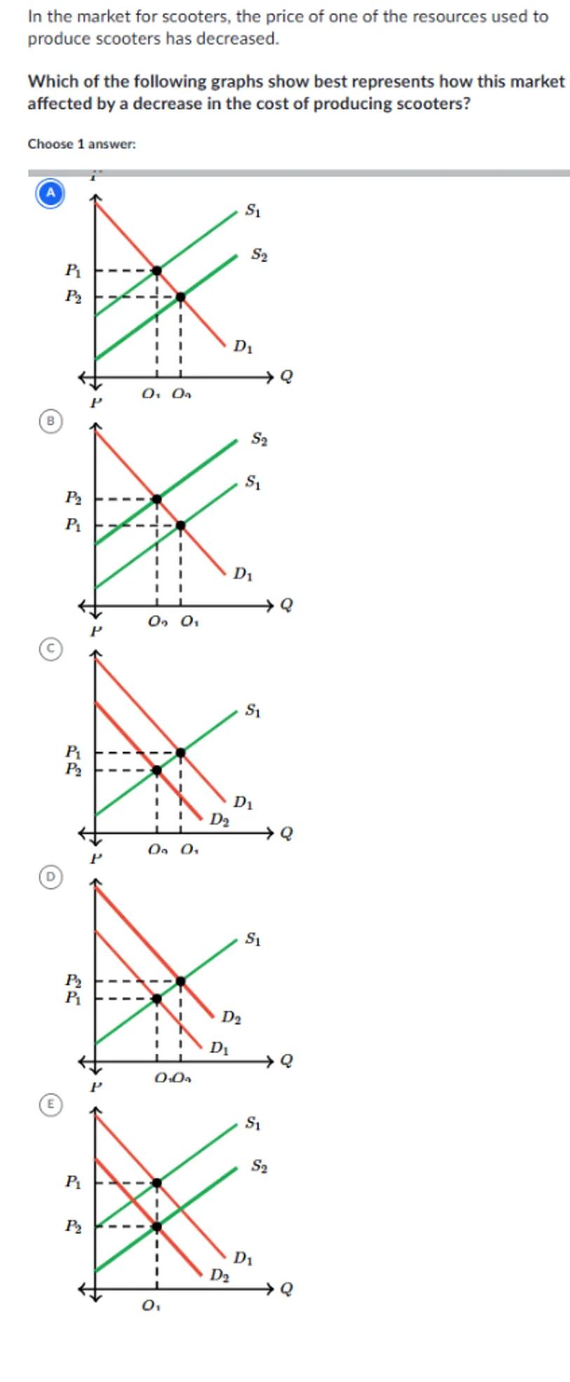 Which of the following graphs show best represents how this market affected by a decrease in the cost of producing scooters?