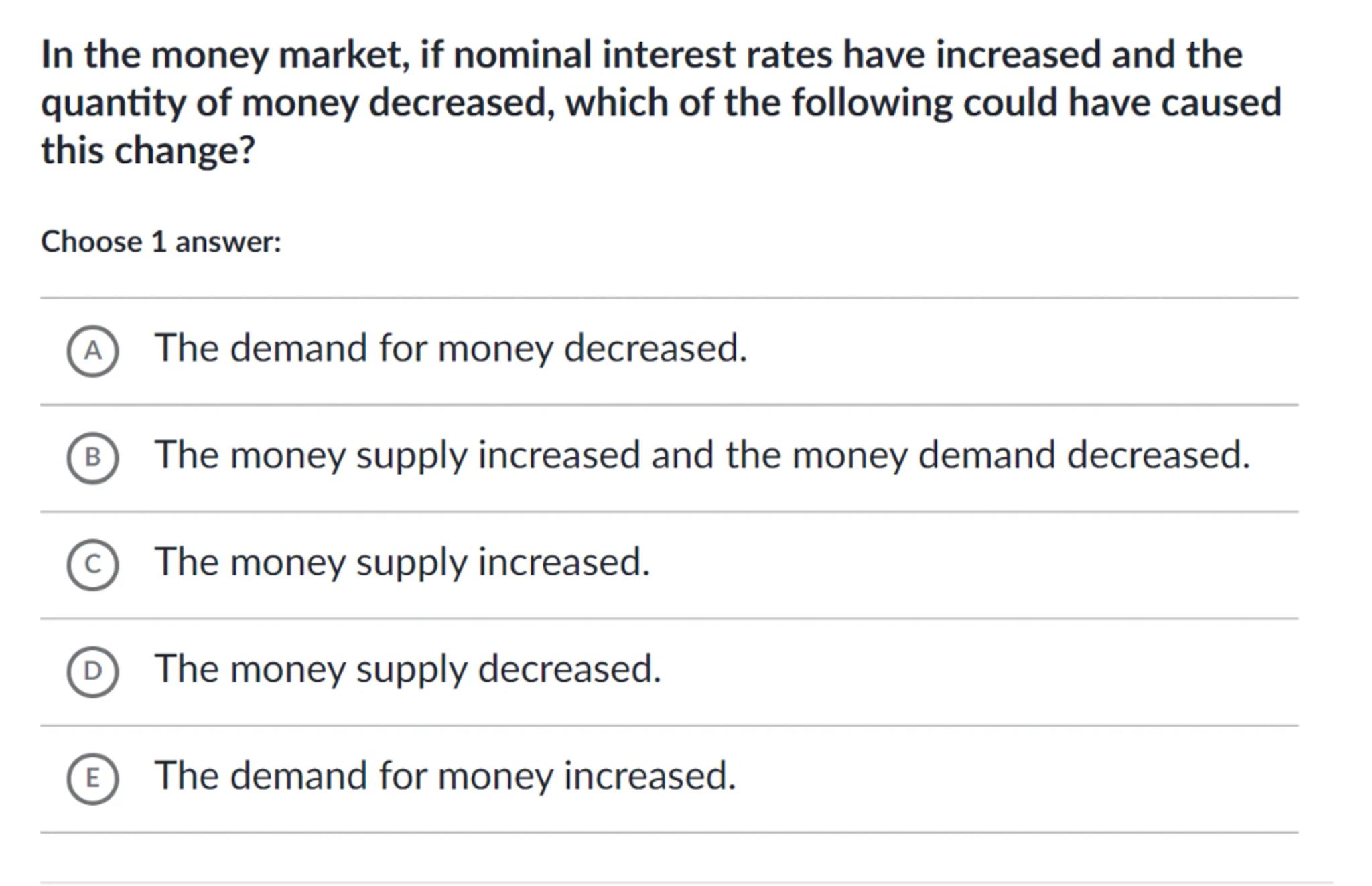 In the money market, if nominal interest rates have increased and the quantity of money decreased, which of the following could have caused this change?