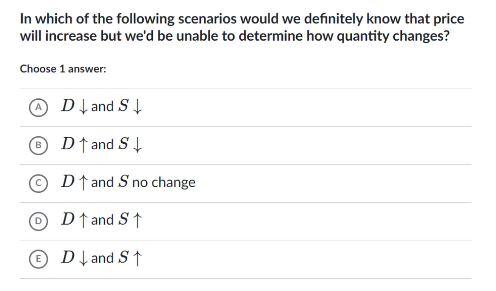 In which of the following scenarios would we definitely know that price will increase but we'd be unable to determine how quantity changes?
