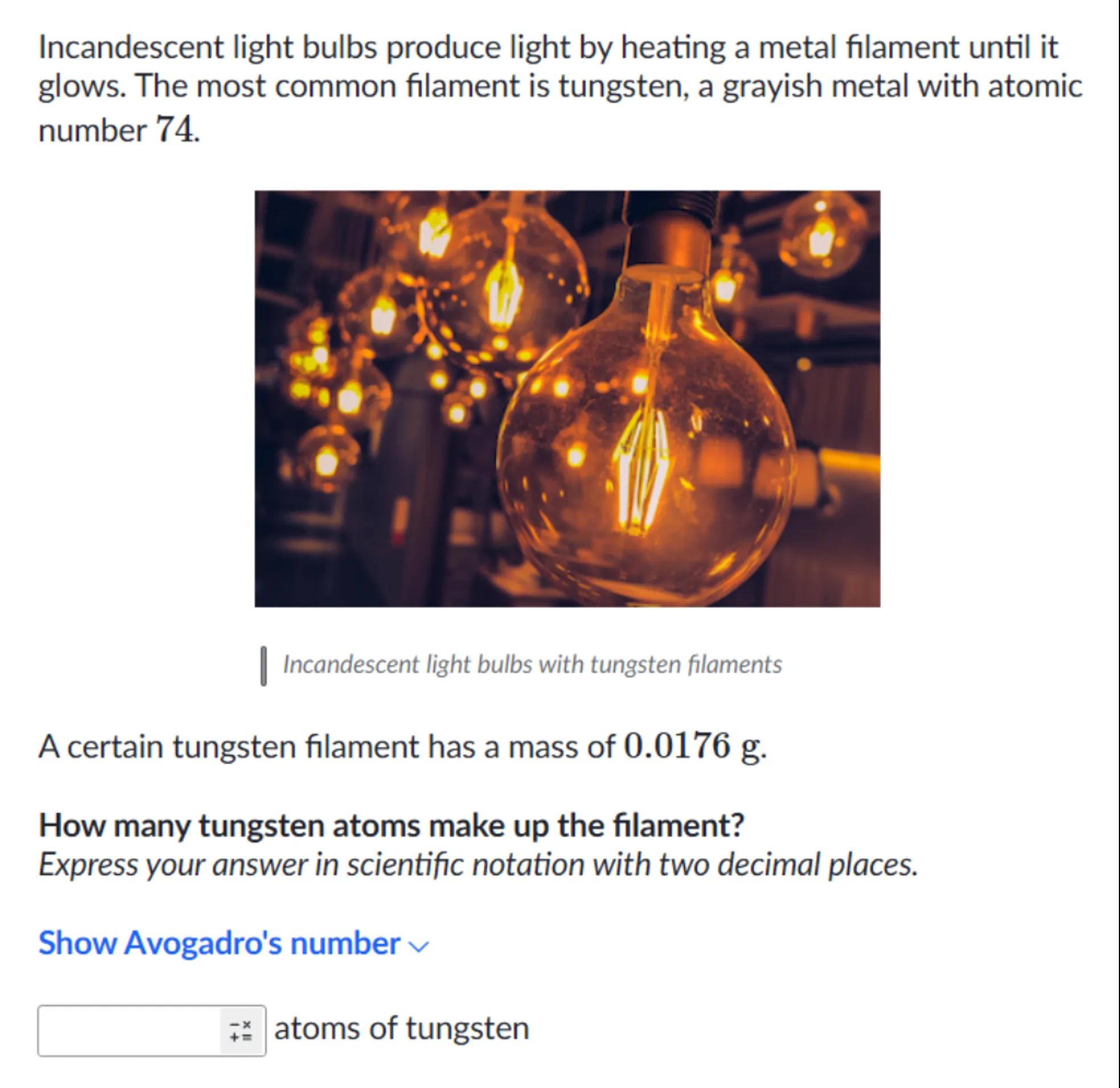 Incandescent light bulbs produce light by heating a metal filament until it glows. The most common filament is tungsten, a grayish metal with atomic number 74 .