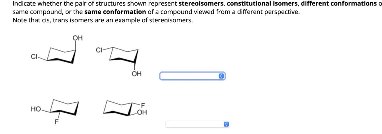 Indicate whether the pair of structures shown represent stereoisomers, constitutional isomers, different conformations o same compound, or the same conformation of a compound viewed from a different perspective.