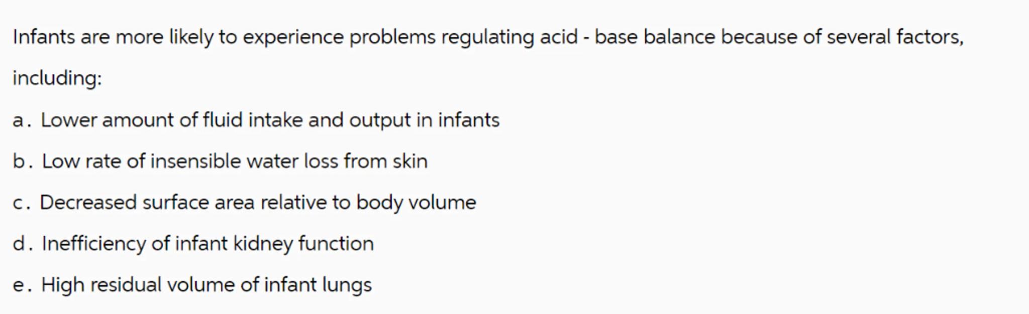 Infants are more likely to experience problems regulating acid - base balance because of several factors, including: