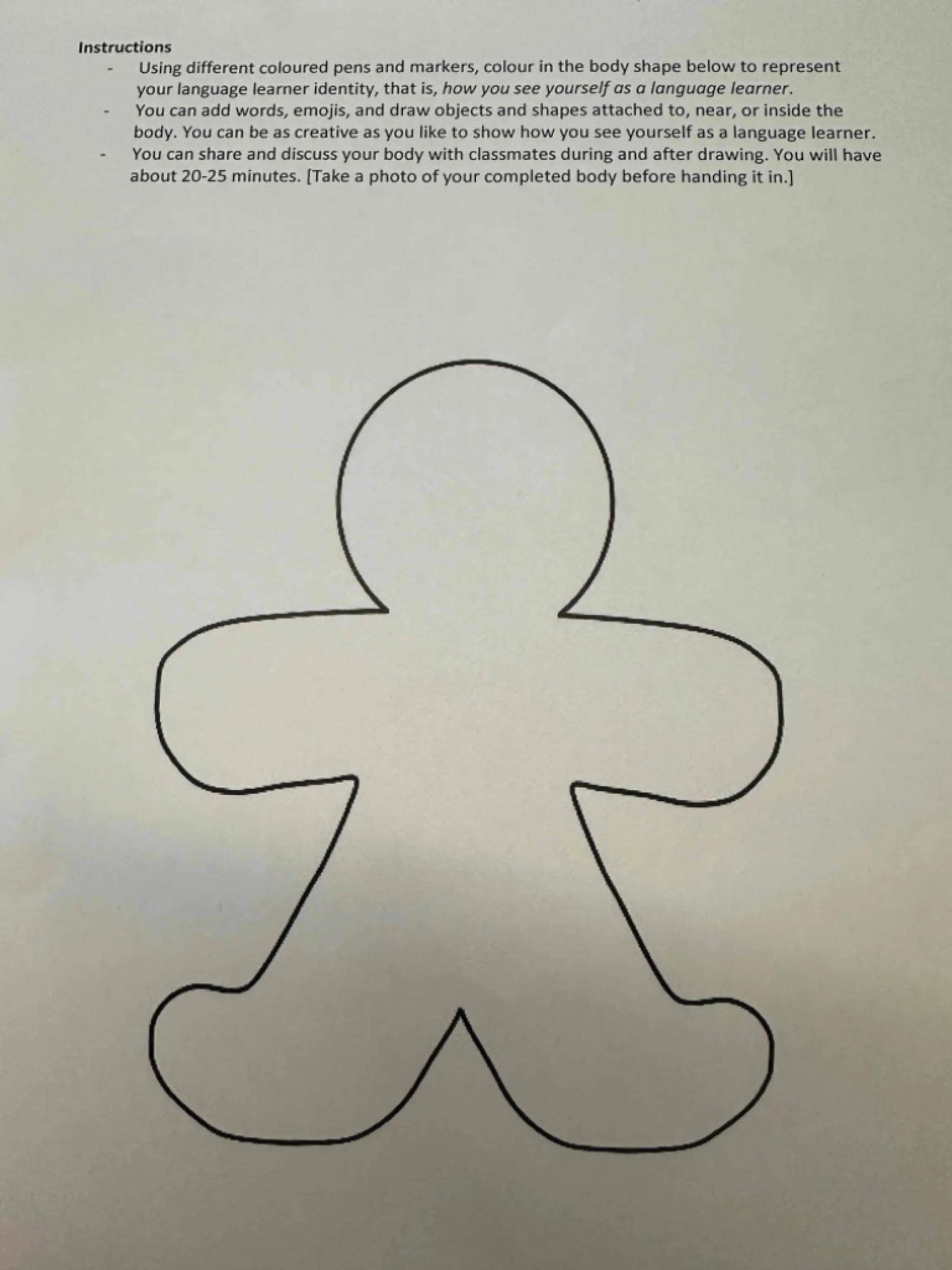 Using different coloured pens and markers, colour in the body shape below to represent your language learner identity, that is, how you see yourself as a language learner.