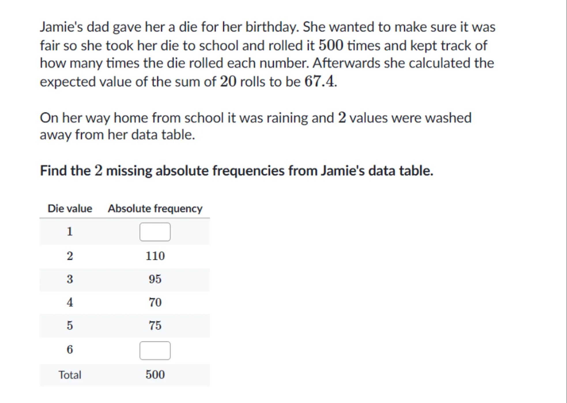 Jamie's dad gave her a die for her birthday. She wanted to make sure it was fair so she took her die to school and rolled it 500 times and kept track of how many times the die rolled each number. Afterwards she calculated the expected value of the sum of 20 rolls to be 67.4 .
