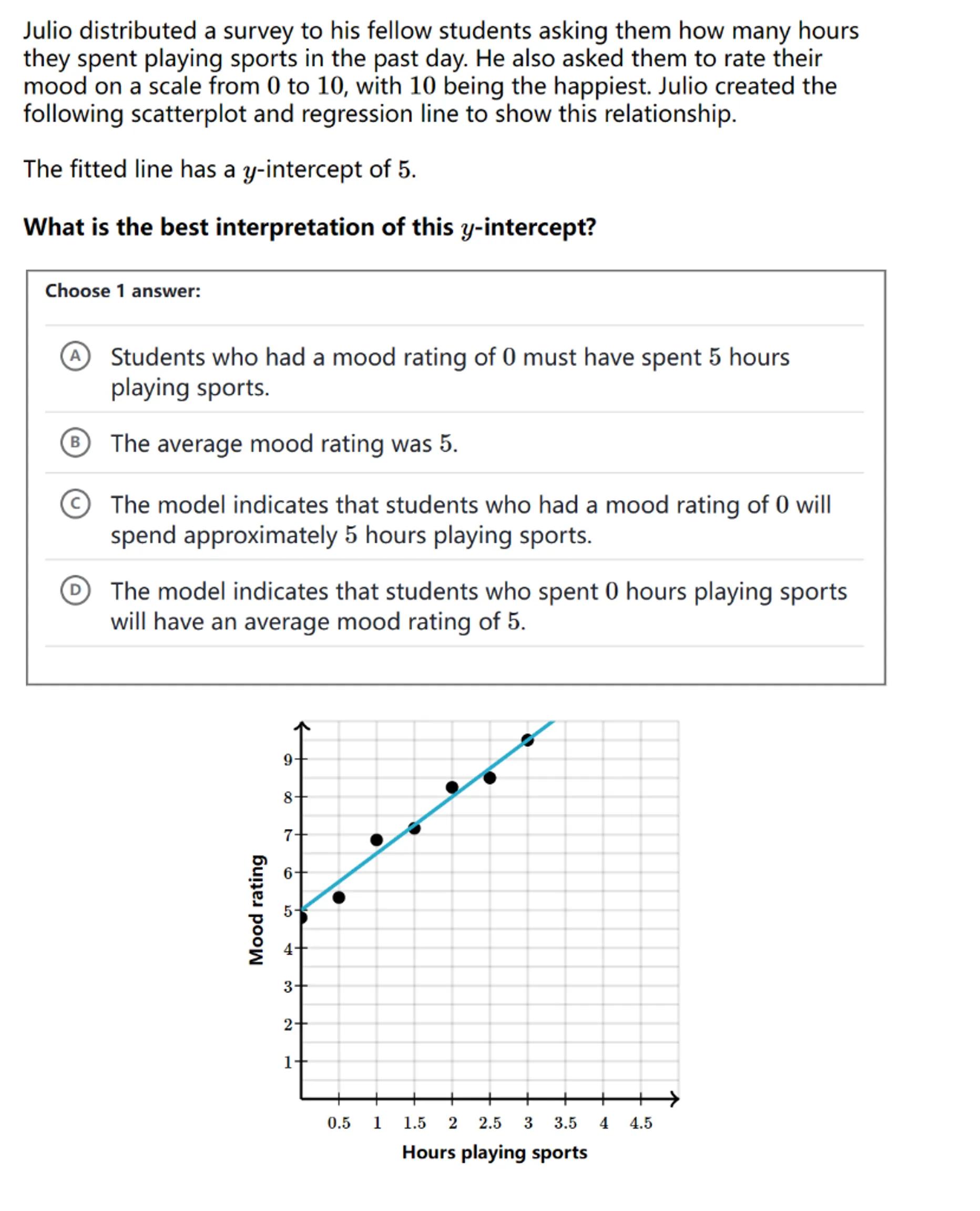 Julio distributed a survey to his fellow students asking them how many hours they spent playing sports in the past day. He also asked them to rate their mood on a scale from 0 to 10 , with 10 being the happiest. Julio created the following scatterplot and regression line to show this relationship.