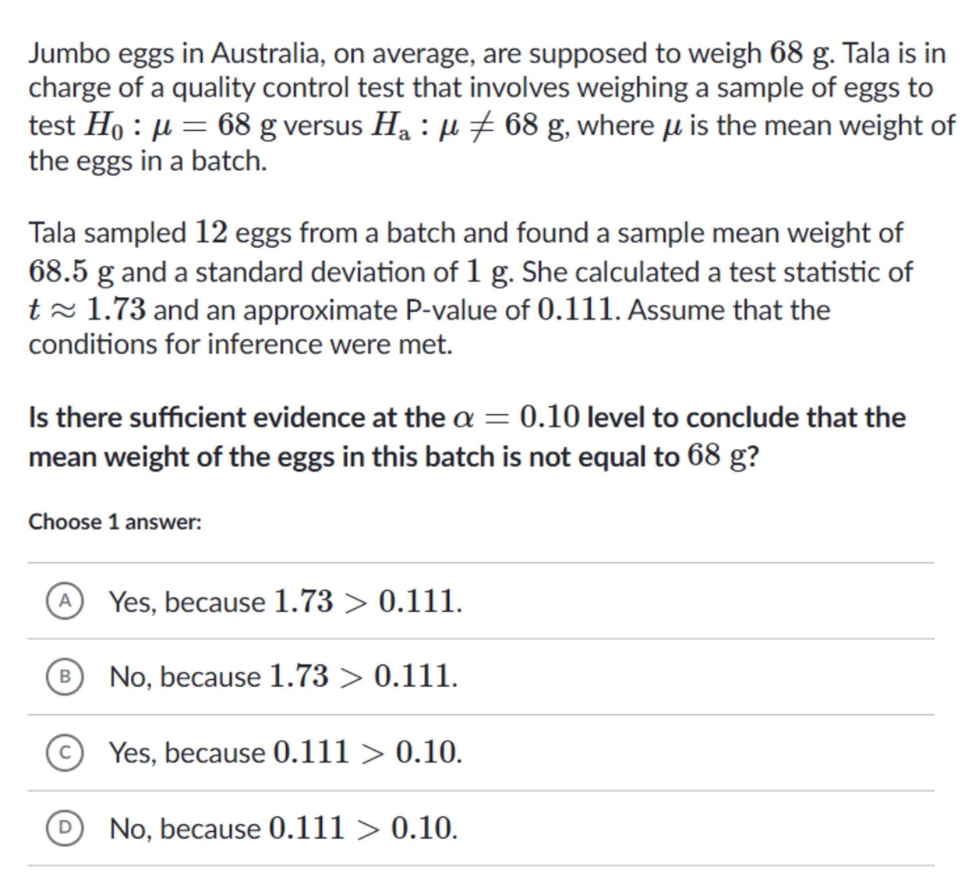 Tala sampled 12 eggs from a batch and found a sample mean weight of and a standard deviation of . She calculated a test statistic of and an approximate -value of 0.111 . Assume that the conditions for inference were met.