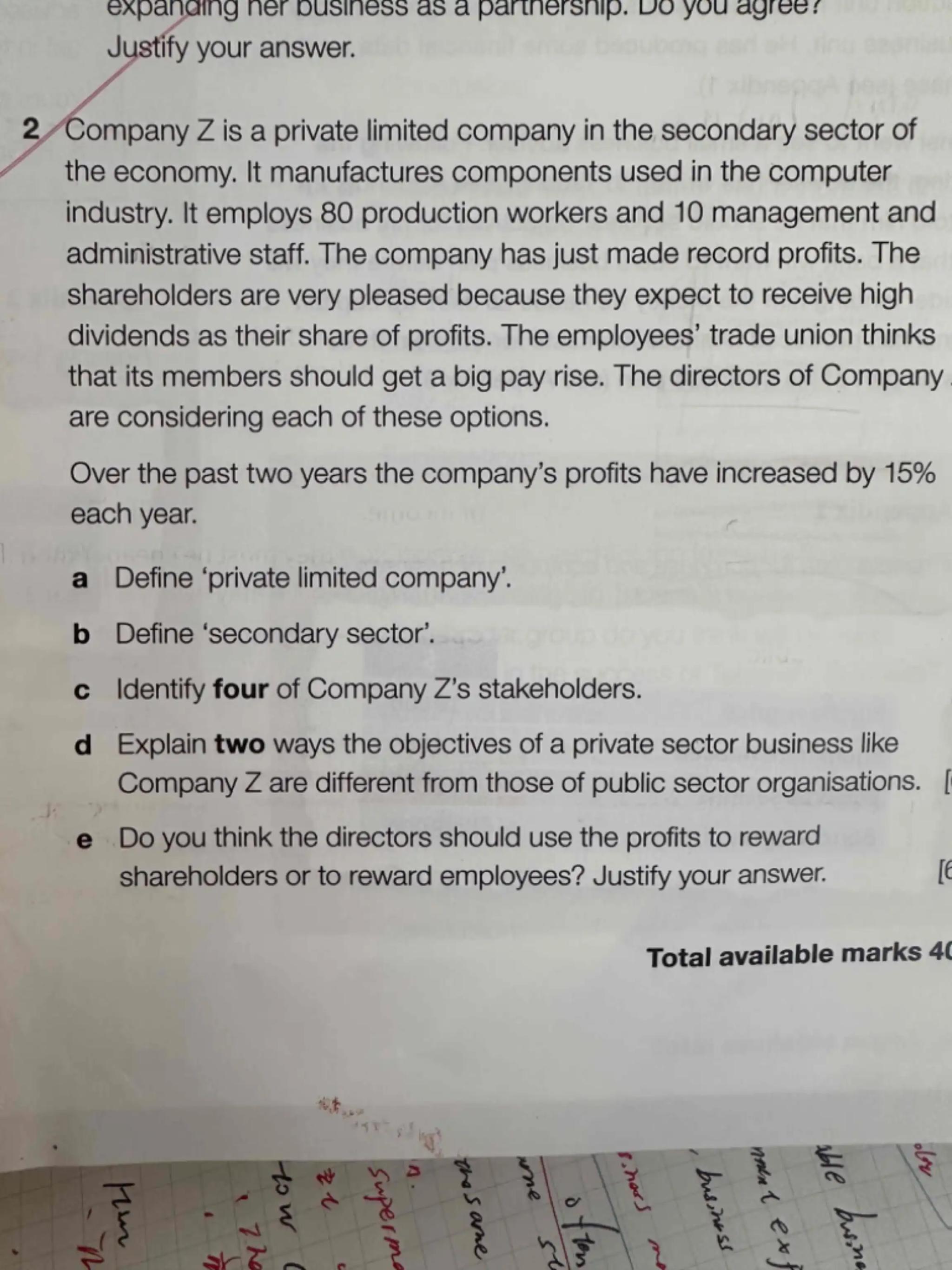2 Company Z is a private limited company in the secondary sector of the economy. It manufactures components used in the computer industry. It employs 80 production workers and 10 management and administrative staff. The company has just made record profits. The shareholders are very pleased because they expect to receive high dividends as their share of profits. The employees' trade union thinks that its members should get a big pay rise. The directors of Company are considering each of these options.
