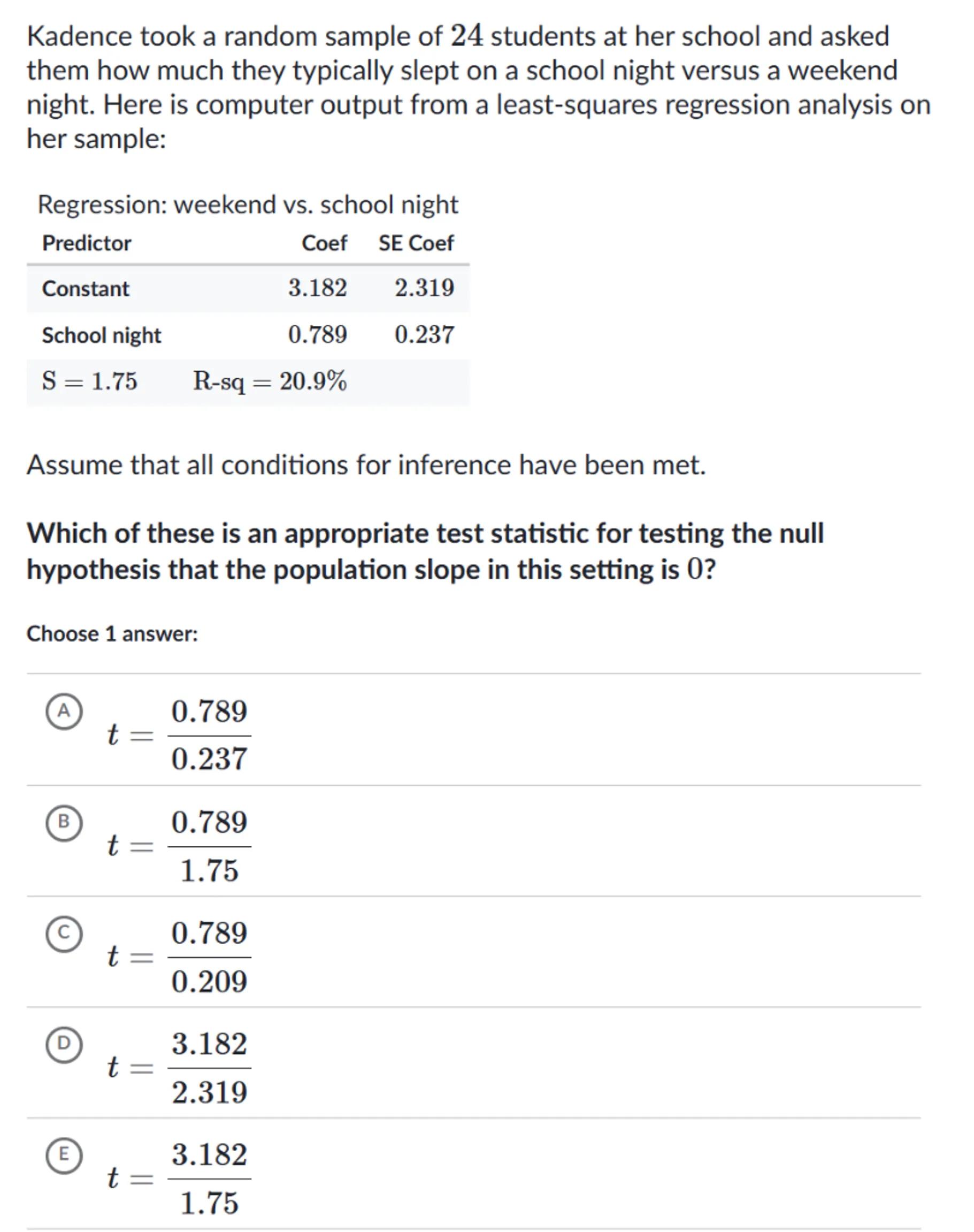 Kadence took a random sample of 24 students at her school and asked them how much they typically slept on a school night versus a weekend night. Here is computer output from a least-squares regression analysis on her sample: