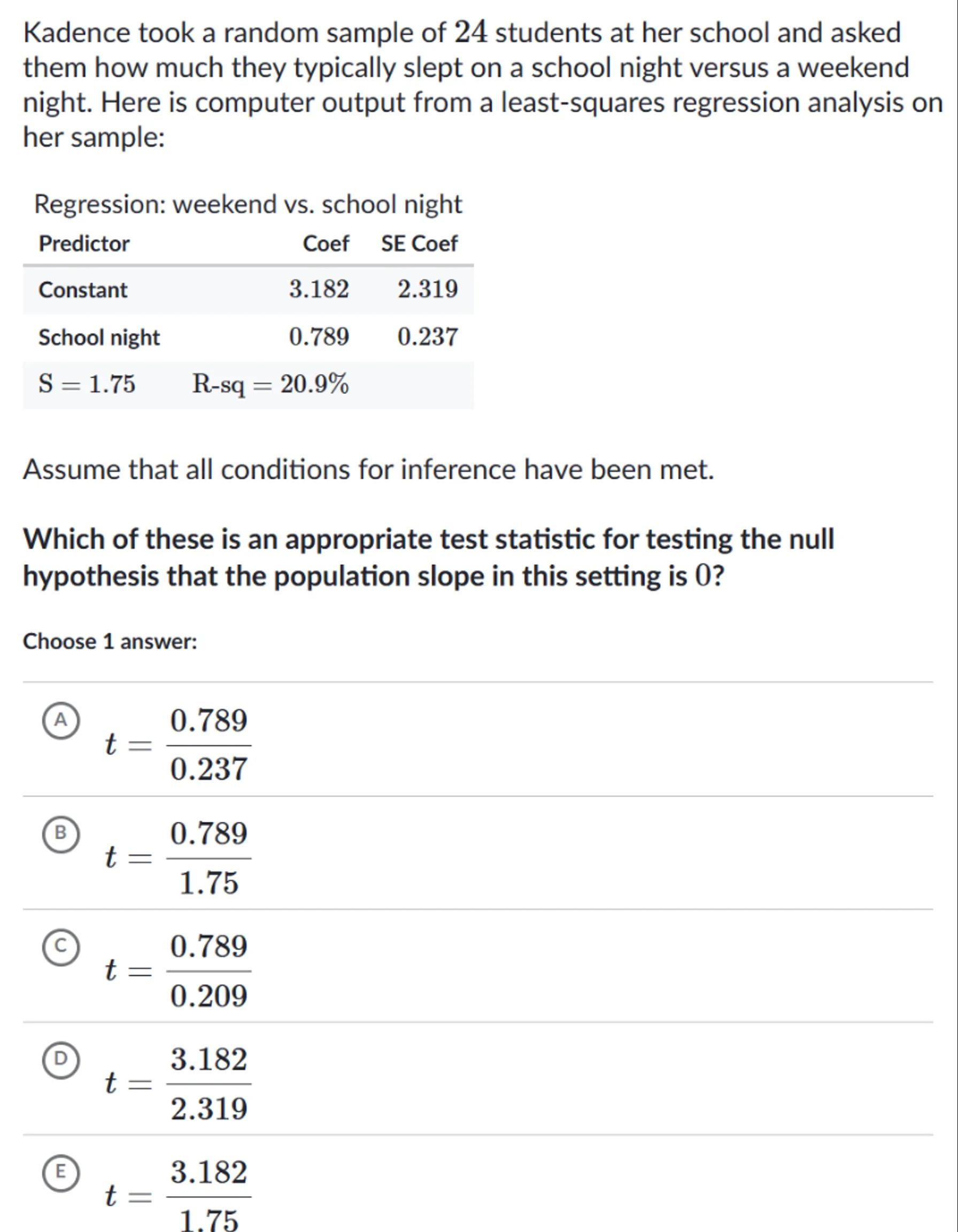 Kadence took a random sample of 24 students at her school and asked them how much they typically slept on a school night versus a weekend night. Here is computer output from a least-squares regression analysis on her sample:
