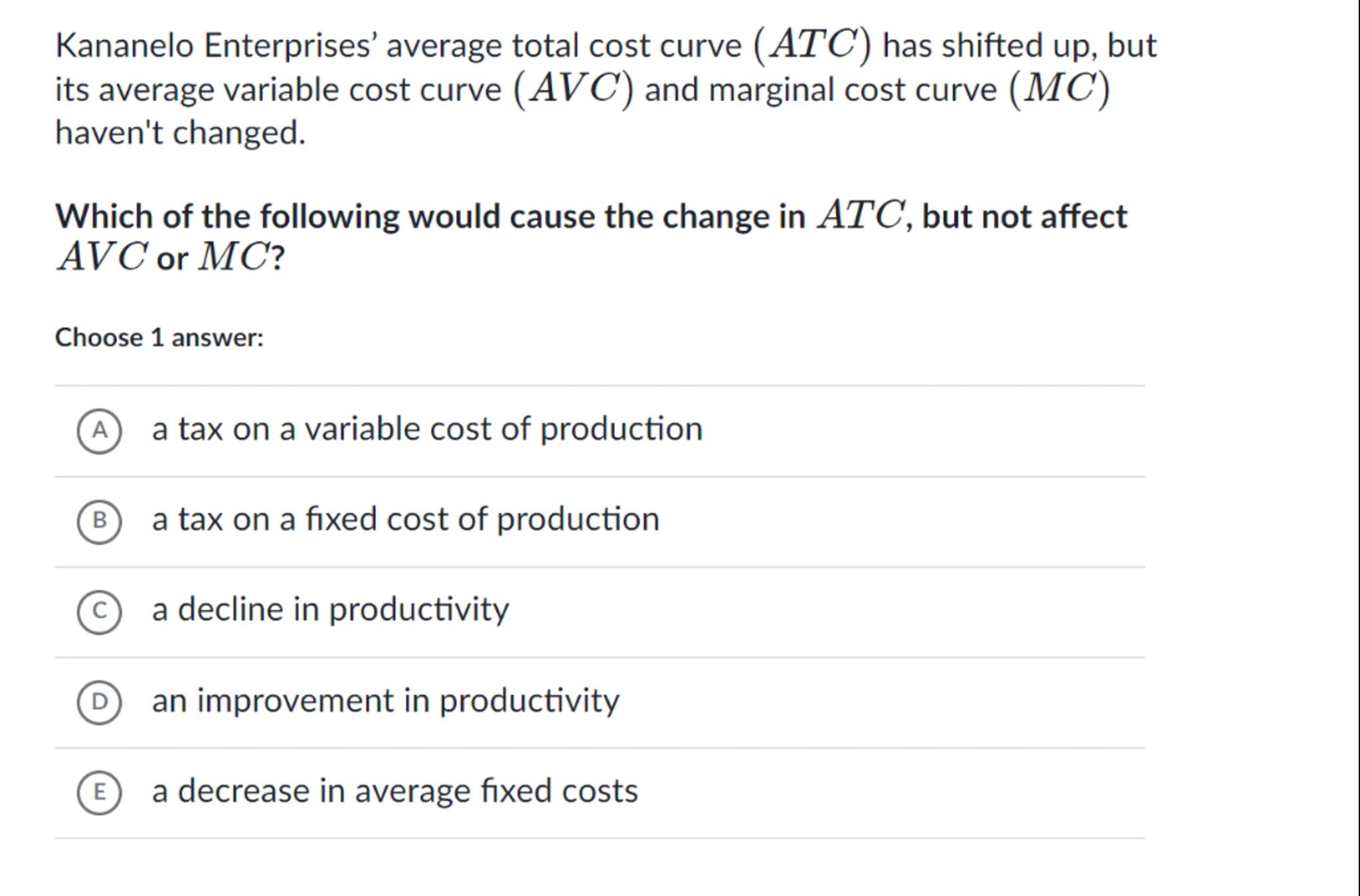 Kananelo Enterprises' average total cost curve has shifted up, but its average variable cost curve and marginal cost curve haven't changed.