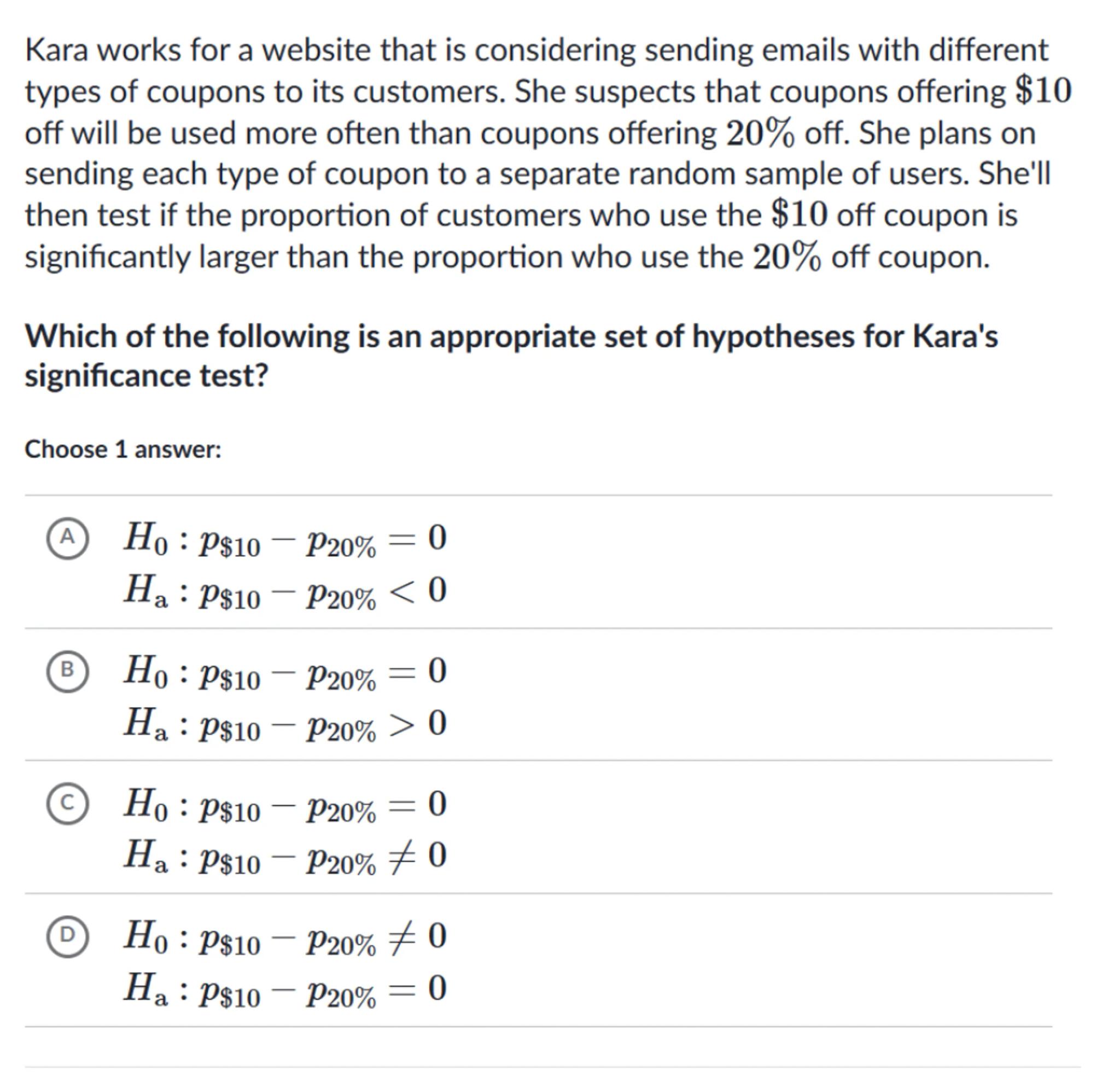 Kara works for a website that is considering sending emails with different types of coupons to its customers. She suspects that coupons offering off will be used more often than coupons offering off. She plans on sending each type of coupon to a separate random sample of users. She'll then test if the proportion of customers who use the off coupon is significantly larger than the proportion who use the off coupon.