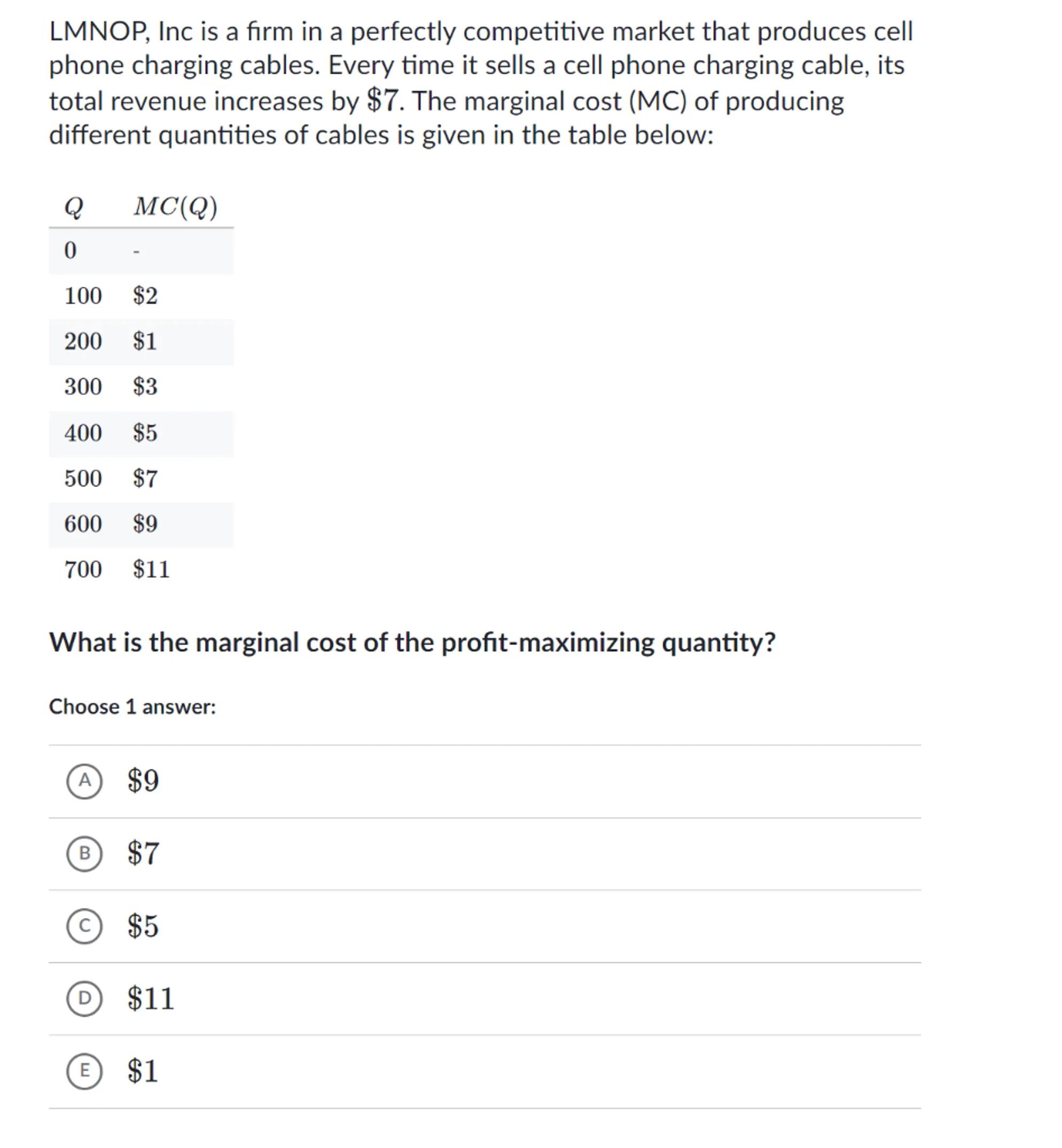 LMNOP, Inc is a firm in a perfectly competitive market that produces cell phone charging cables. Every time it sells a cell phone charging cable, its total revenue increases by . The marginal cost (MC) of producing different quantities of cables is given in the table below: