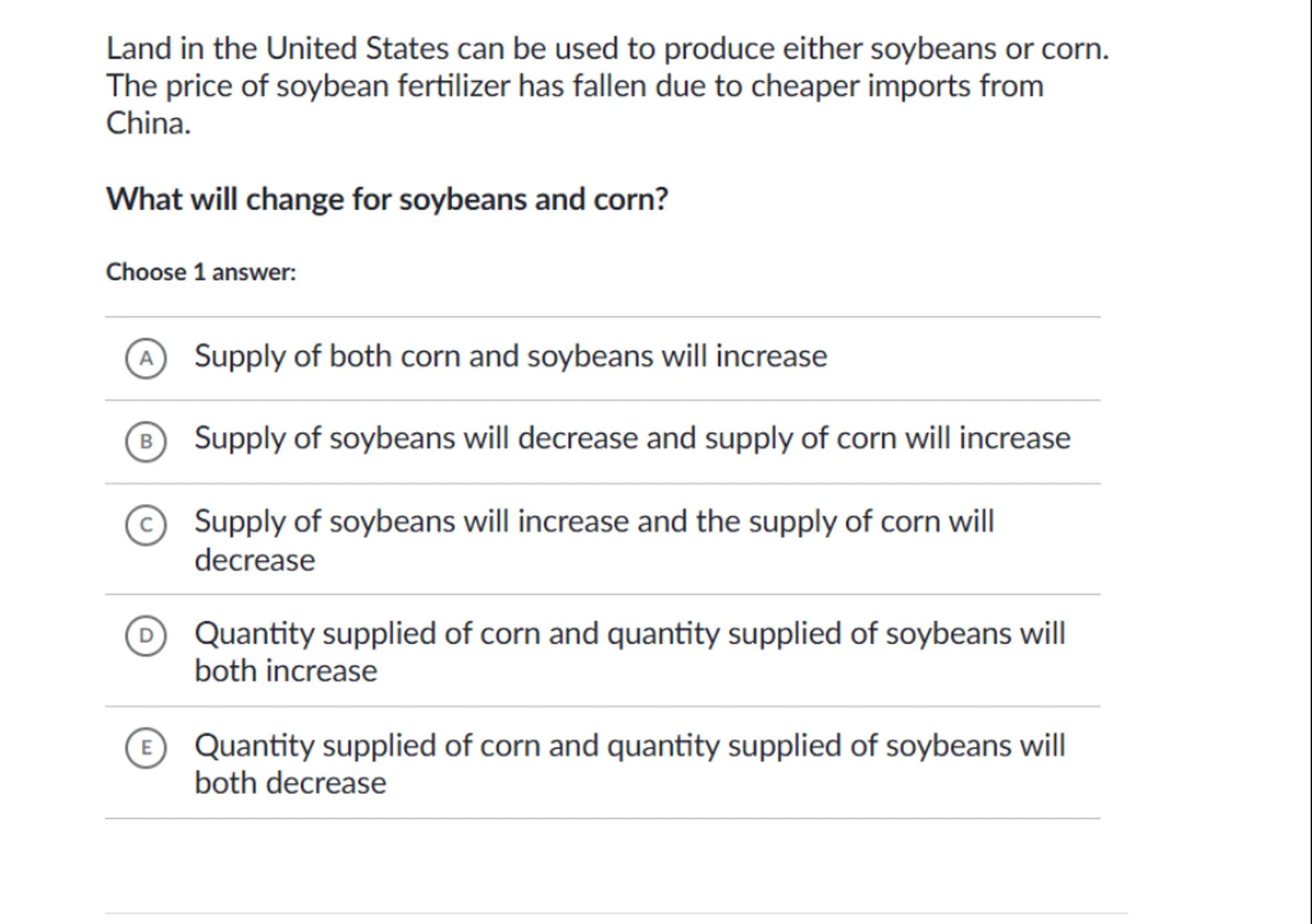(E) Quantity supplied of corn and quantity supplied of soybeans will both decrease