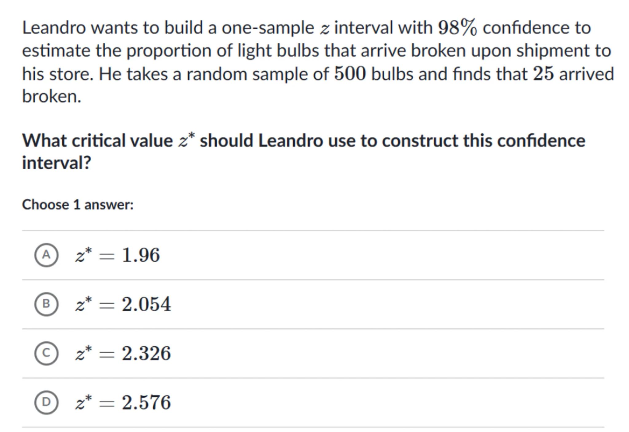 Leandro wants to build a one-sample interval with confidence to estimate the proportion of light bulbs that arrive broken upon shipment to his store. He takes a random sample of 500 bulbs and finds that 25 arrived broken.