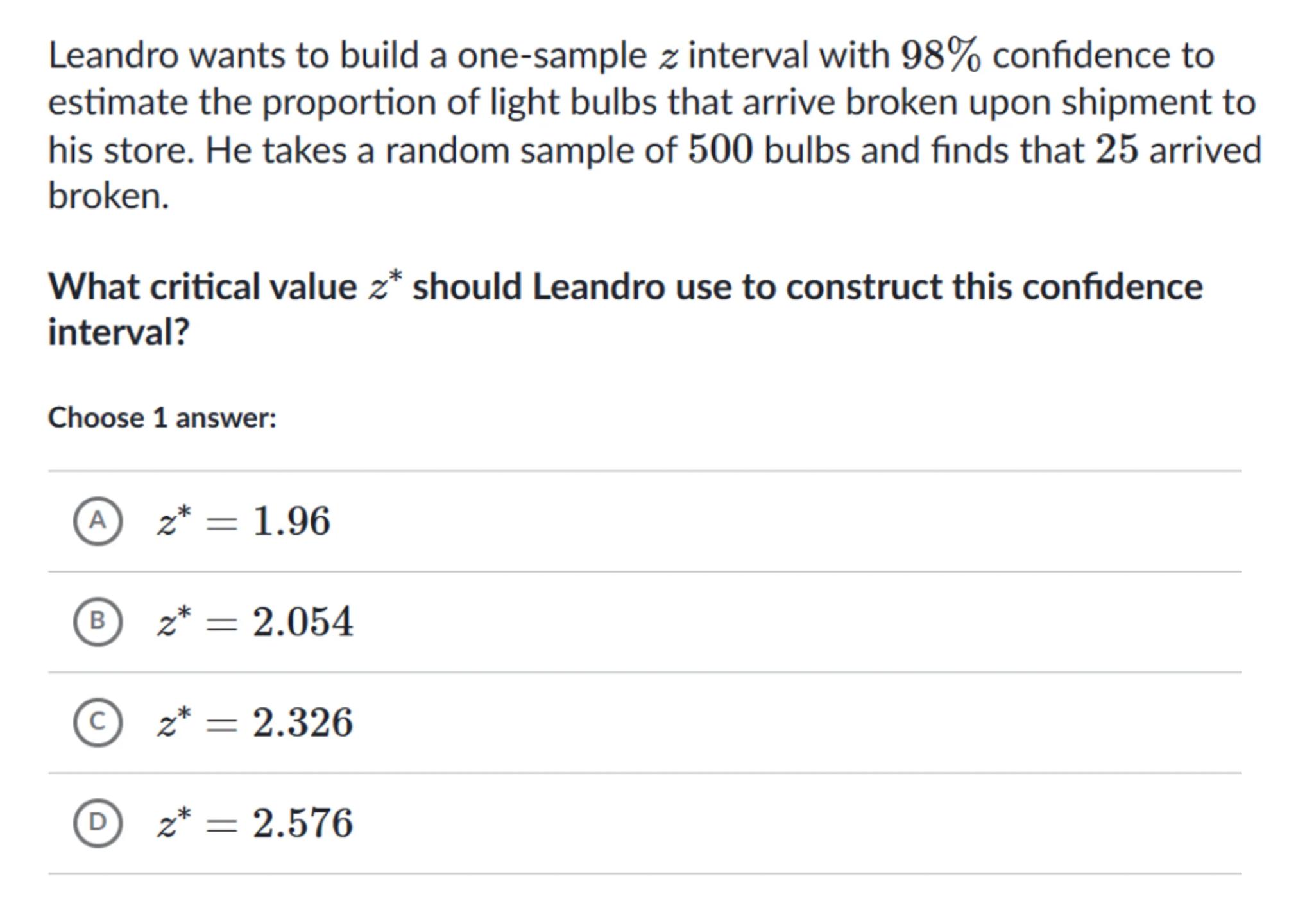 Leandro wants to build a one-sample zz interval with 98%98 \% confidence to estimate the proportion of light bulbs that arrive broken upon shipment to his store. He takes a random sample of 500 bulbs and finds that 25 arrived broken.