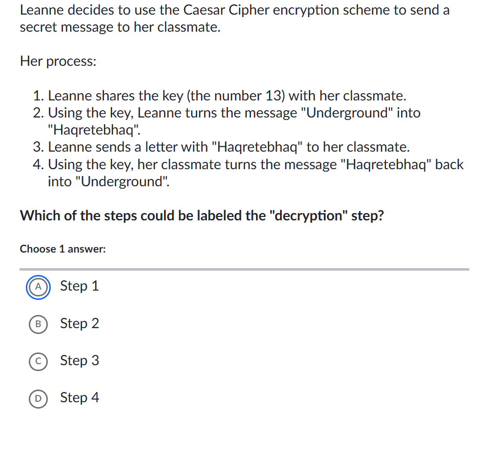 Leanne decides to use the Caesar Cipher encryption scheme to send a