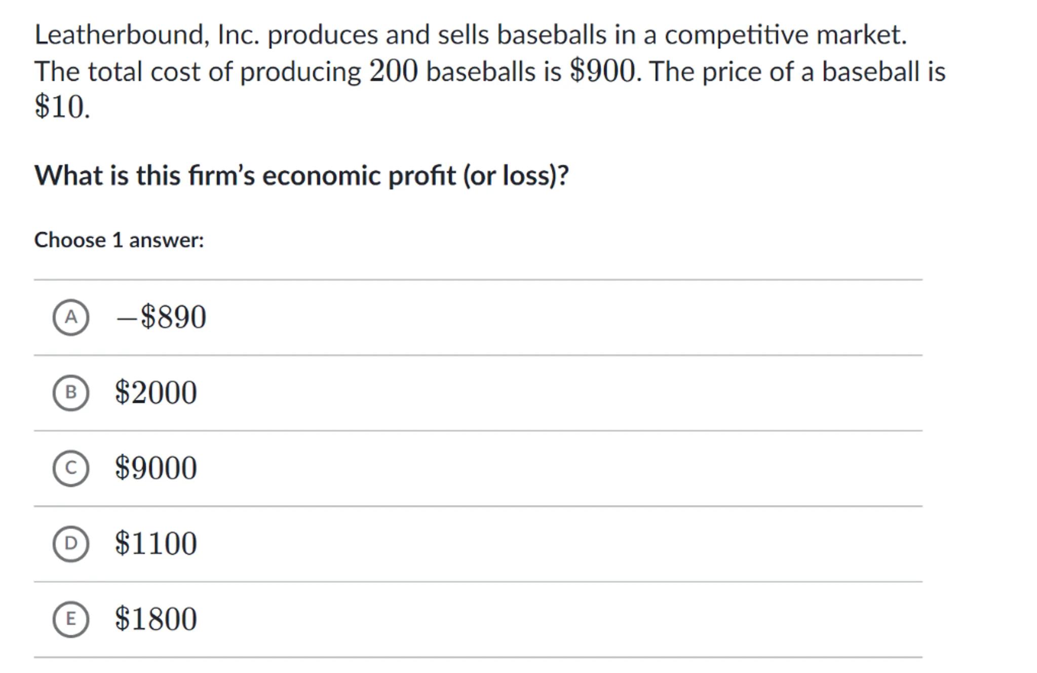 Leatherbound, Inc. produces and sells baseballs in a competitive market. The total cost of producing 200 baseballs is . The price of a baseball is .