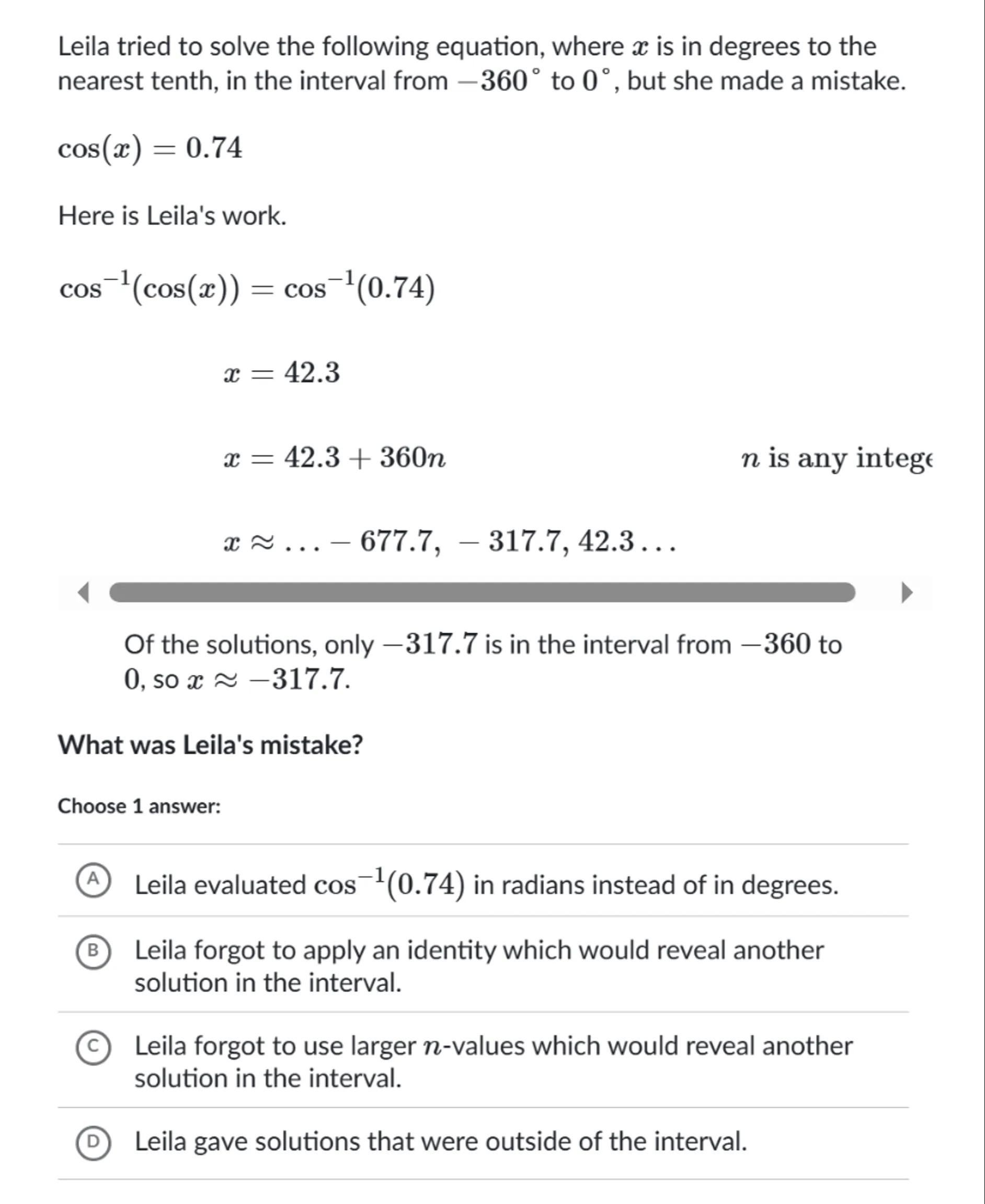 Leila tried to solve the following equation, where is in degrees to the nearest tenth, in the interval from to , but she made a mistake.