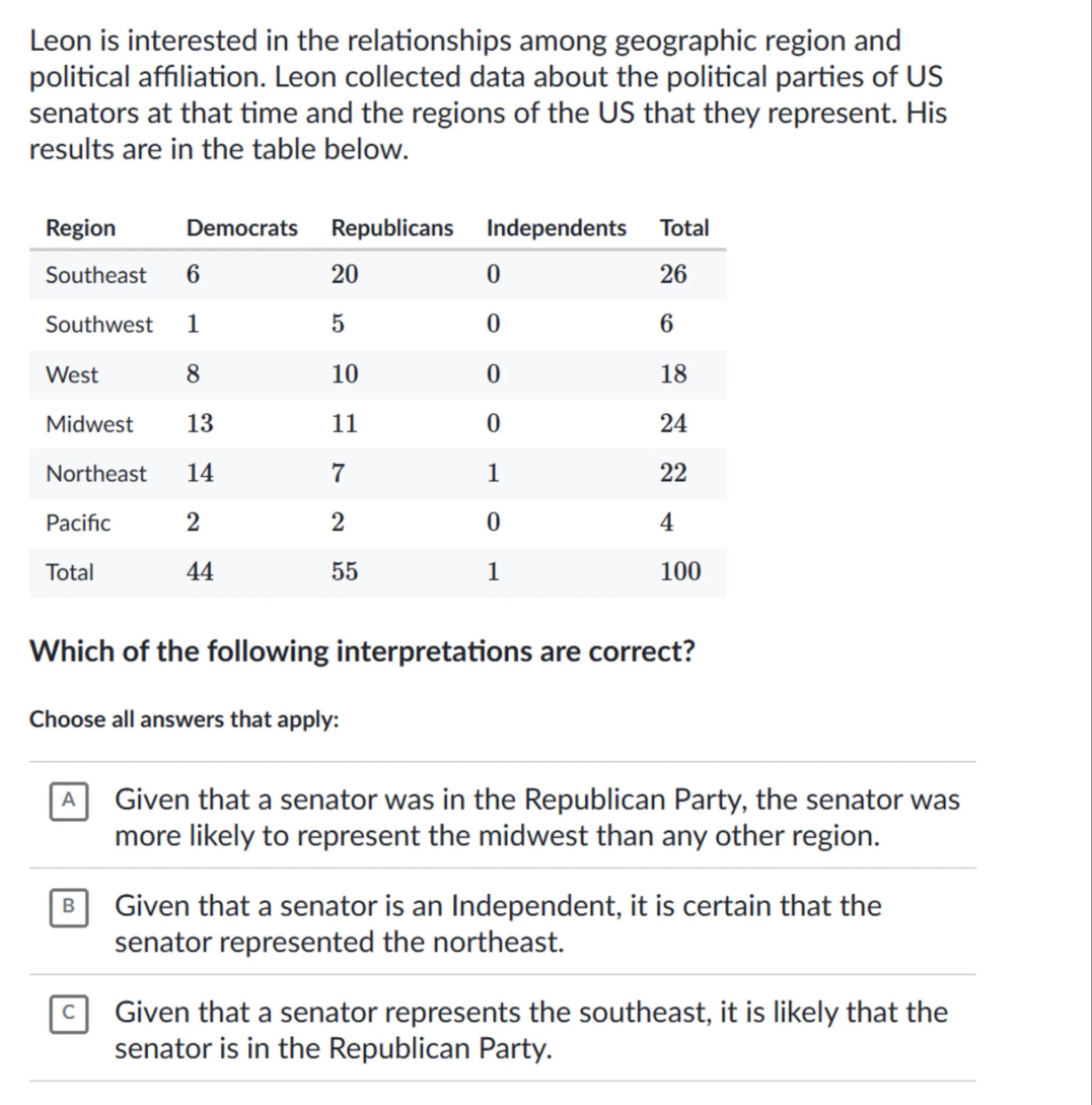 Leon is interested in the relationships among geographic region and political affiliation. Leon collected data about the political parties of US senators at that time and the regions of the US that they represent. His results are in the table below.