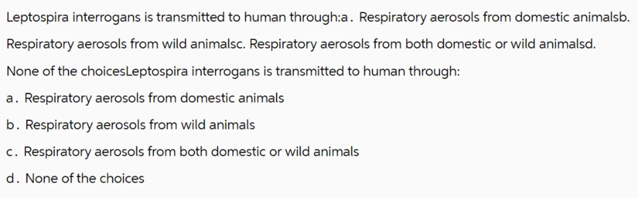 Leptospira interrogans is transmitted to human through:a. Respiratory aerosols from domestic animalsb.