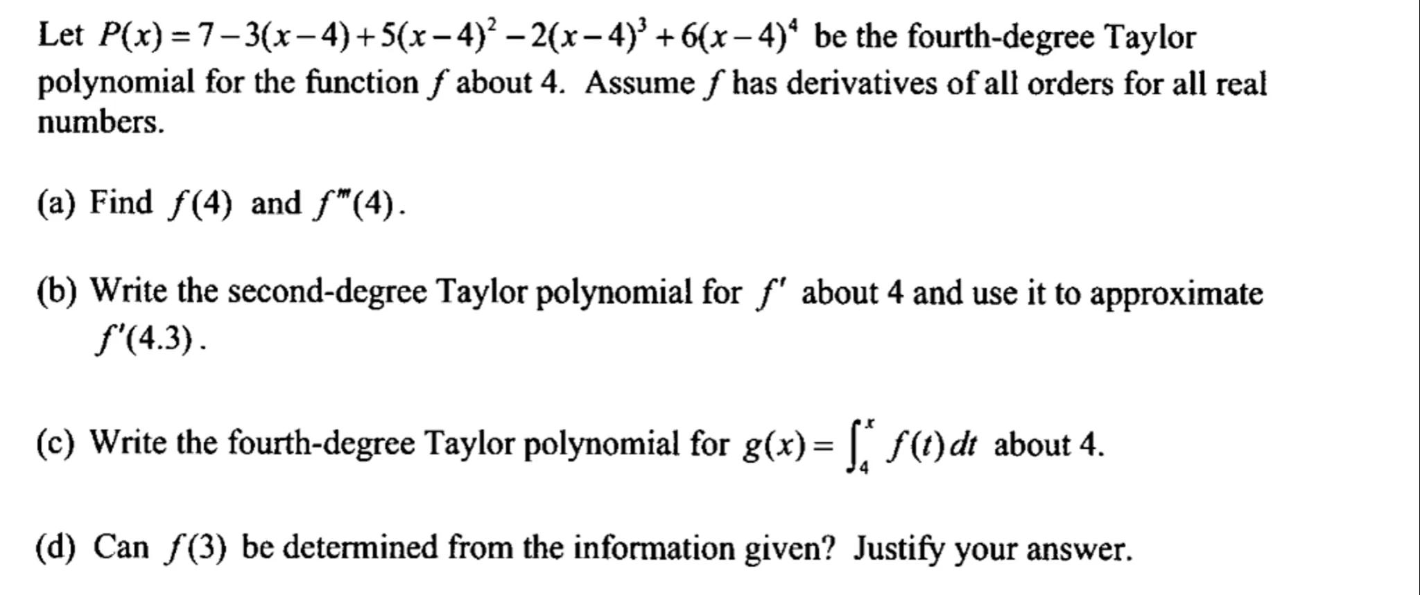 (c) Write the fourth-degree Taylor polynomial for about 4 .