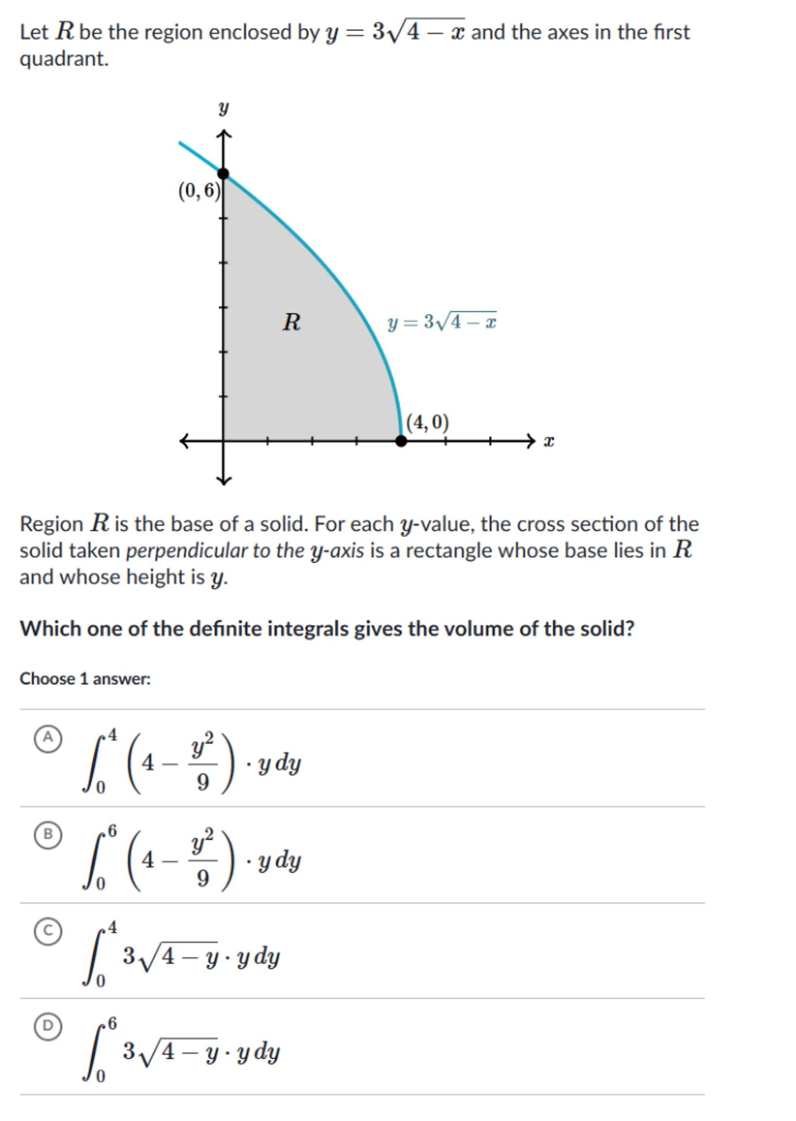 Region is the base of a solid. For each -value, the cross section of the solid taken perpendicular to the -axis is a rectangle whose base lies in and whose height is .