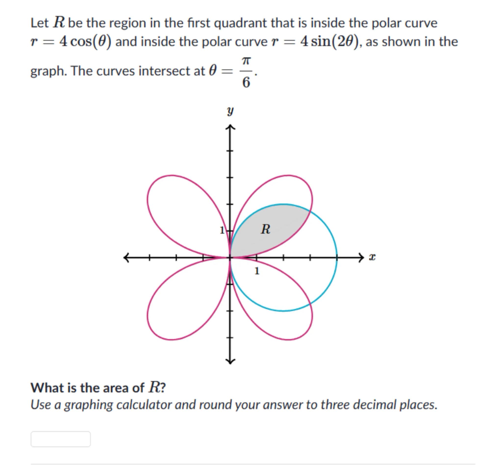 Let be the region in the first quadrant that is inside the polar curve and inside the polar curve , as shown in the graph. The curves intersect at .