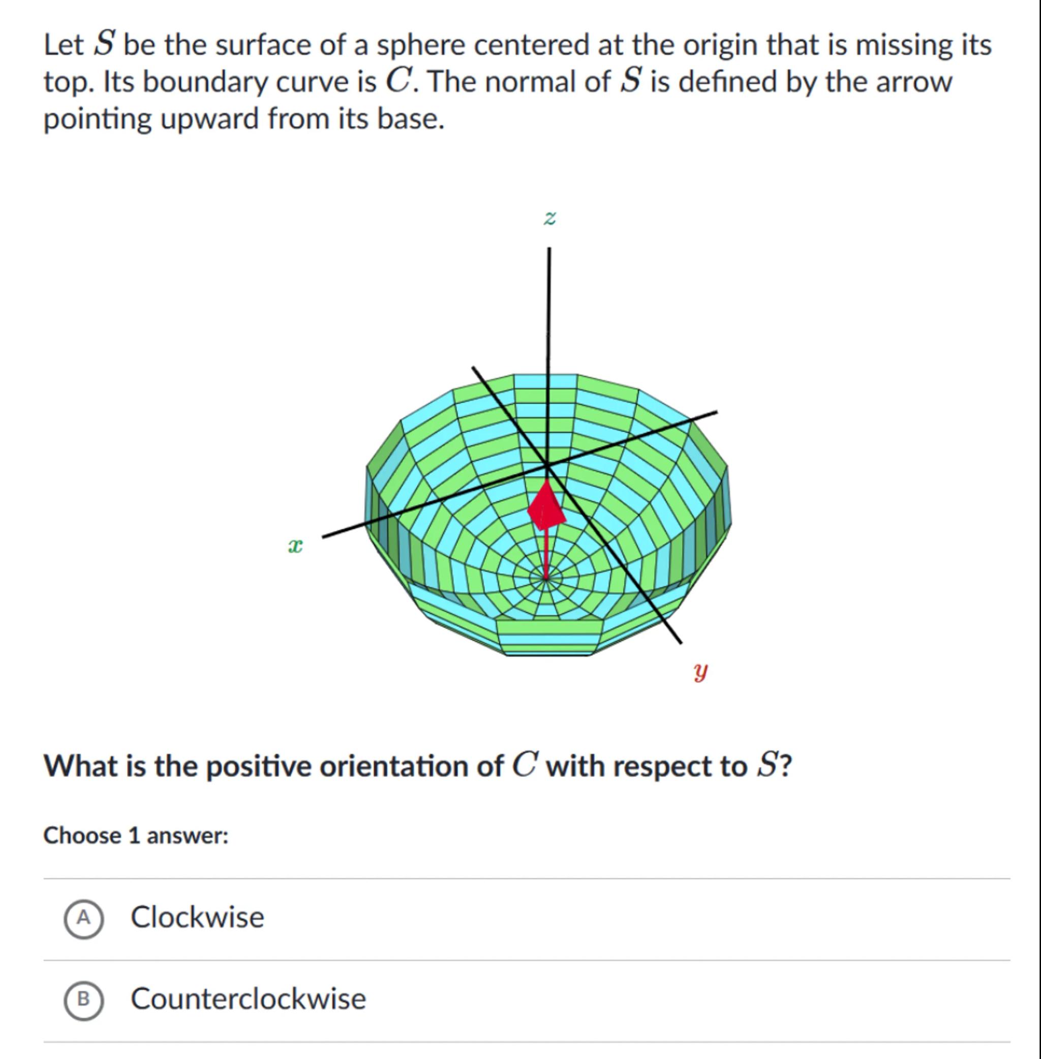 Let be the surface of a sphere centered at the origin that is missing its top. Its boundary curve is . The normal of is defined by the arrow pointing upward from its base.