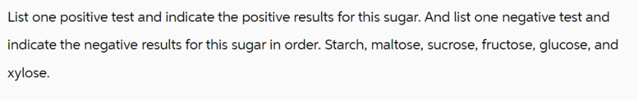 List one positive test and indicate the positive results for this sugar. And list one negative test and indicate the negative results for this sugar in order. Starch, maltose, sucrose, fructose, glucose, and xylose.